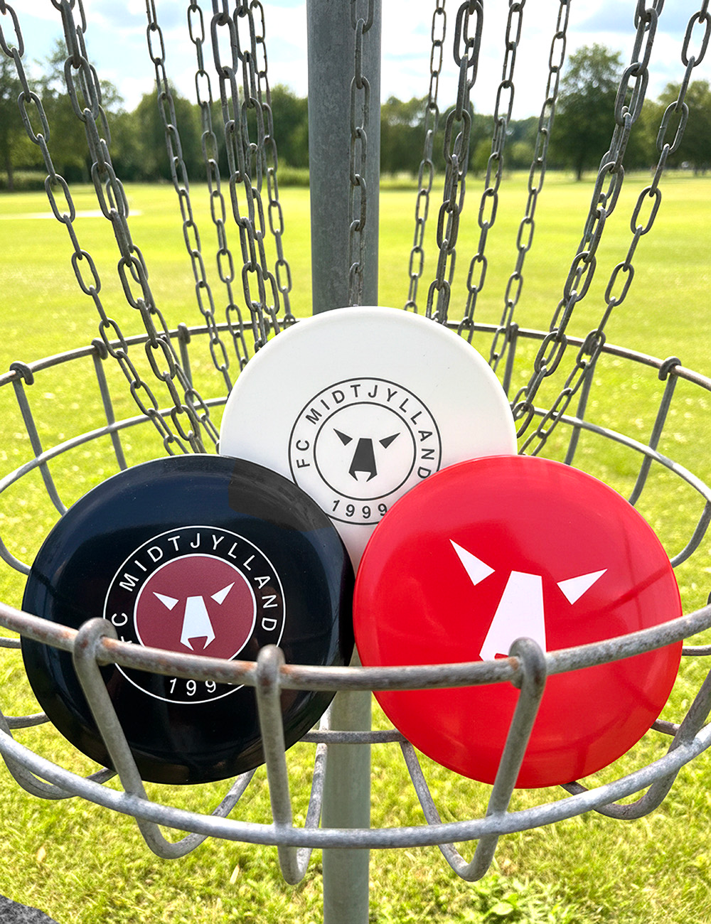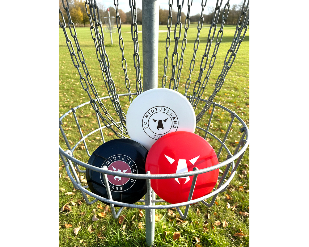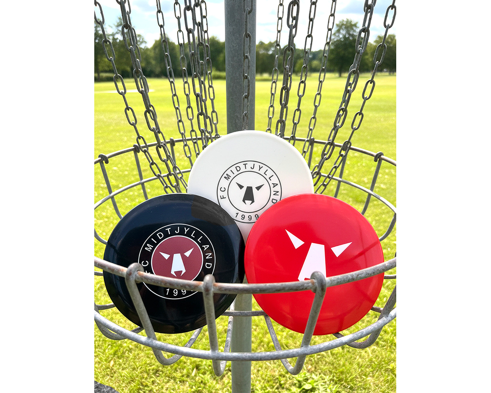 Tag din kærlighed til FC Midtjylland med ud på banen! Denne FCM Disc Golf 3-pak er perfekt til både begyndere og erfarne spillere, der vil kombinere sport og klubstolthed. Sættet indeholder tre discs i ikoniske FCM-farver: hvid, sort og rød – hver med det velkendte ulvelogo.