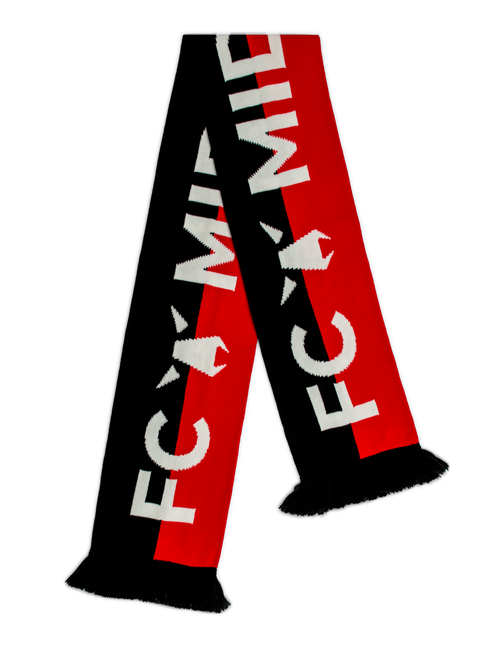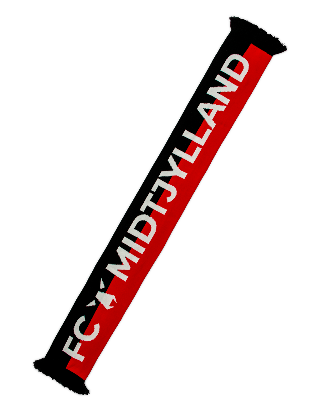 FCM halstørklæde i de klassiske sorte og røde farver, med teksten FC Midtjylland henover.