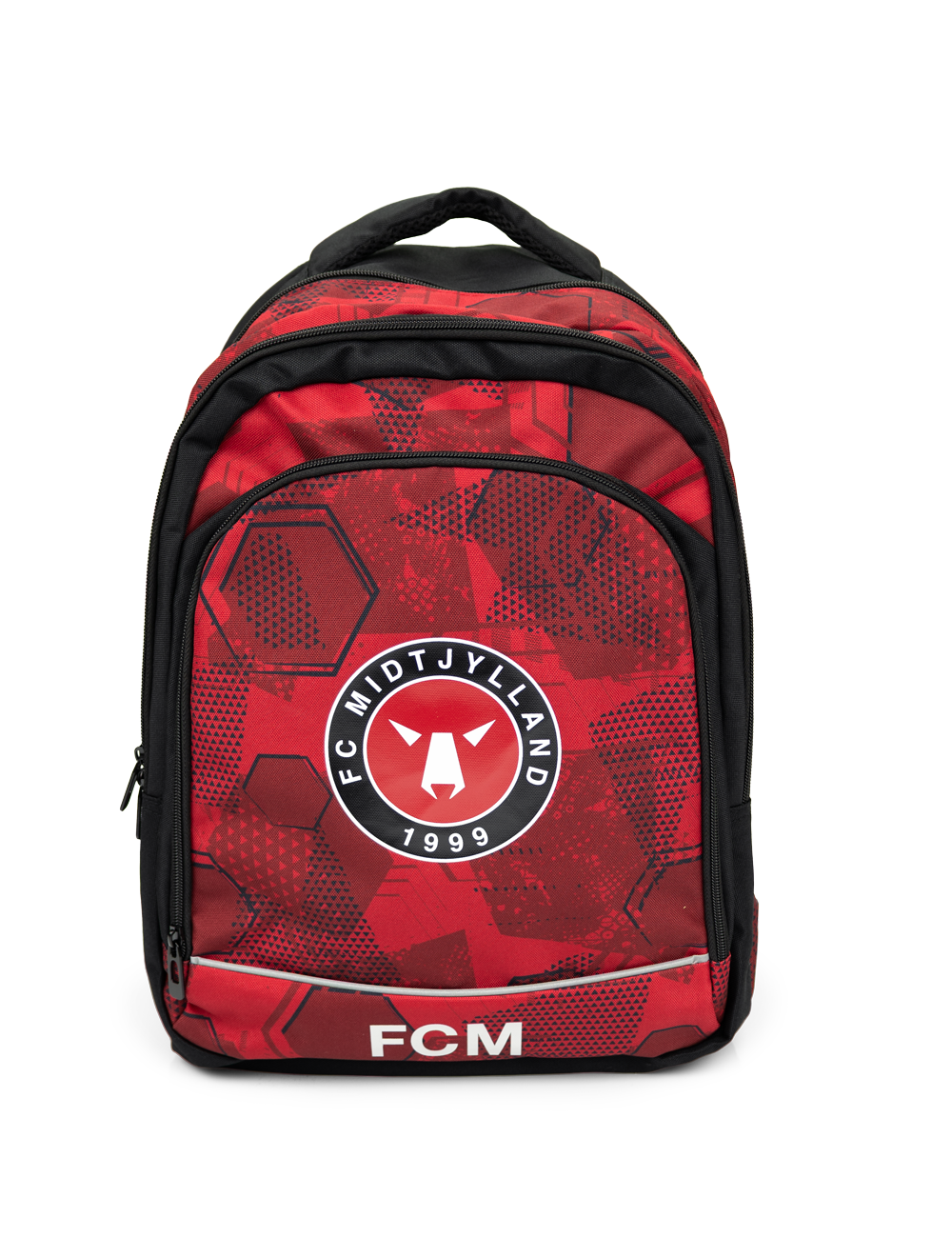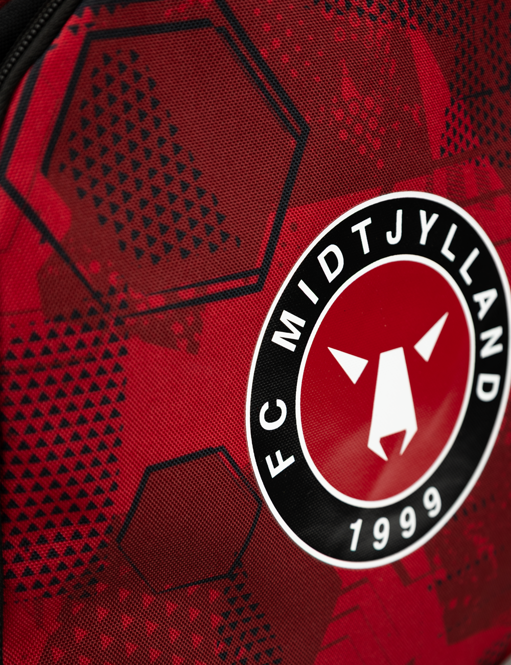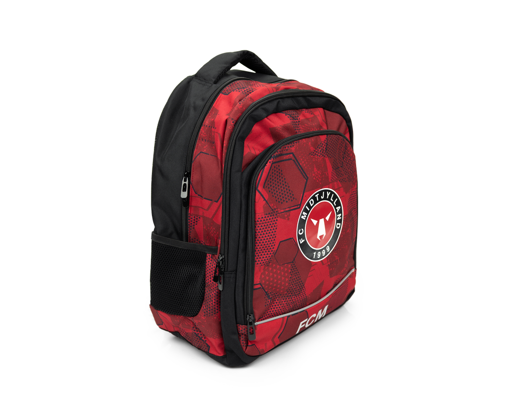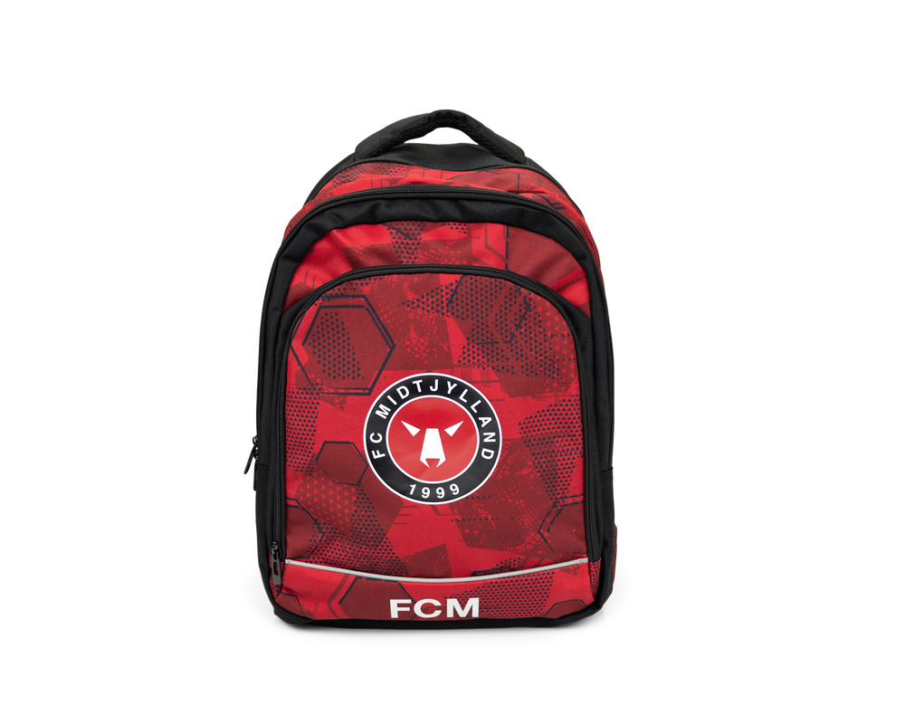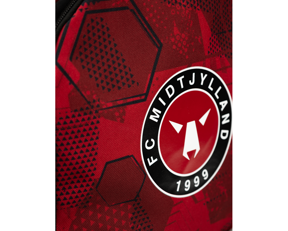 Start skoledagen med FCM-stil! Denne FC Midtjylland skoletaske har et moderne rød/sort mønster med stort logo på fronten. Tasken har god plads til bøger, penalhus og madpakke, samt polstrede stropper og ryg for ekstra komfort.