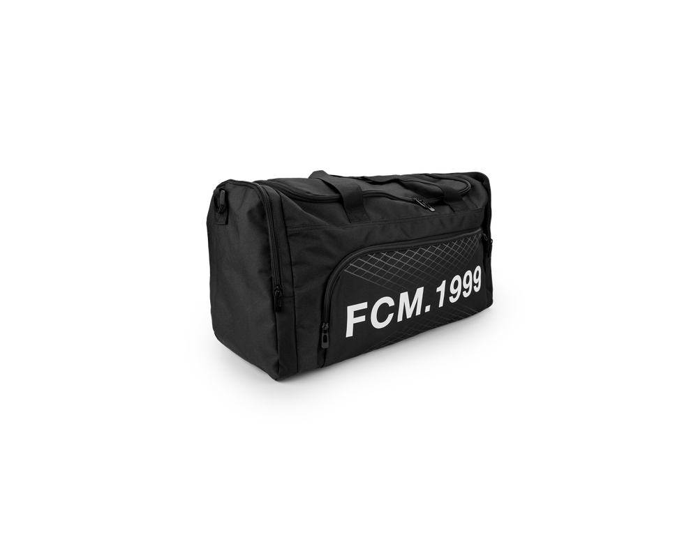 Robust og stilfuld sort sportstaske designet til både hverdag og sport. Tasken har rummelige sidelommer og en praktisk frontlomme til nem opbevaring af dine ting. På den ene side finder du det ikoniske F.C. Midtjylland-logo, og på den anden står "FCM. 1999". Perfekt til træning, weekendture eller som en del af dit FCM-gear!