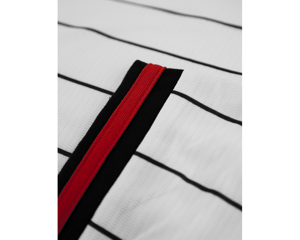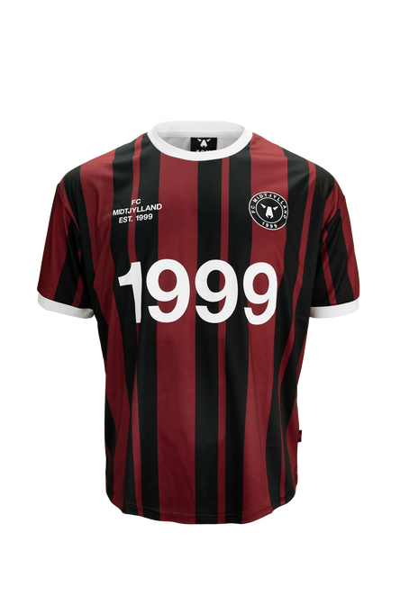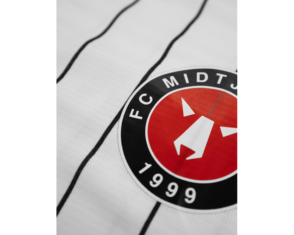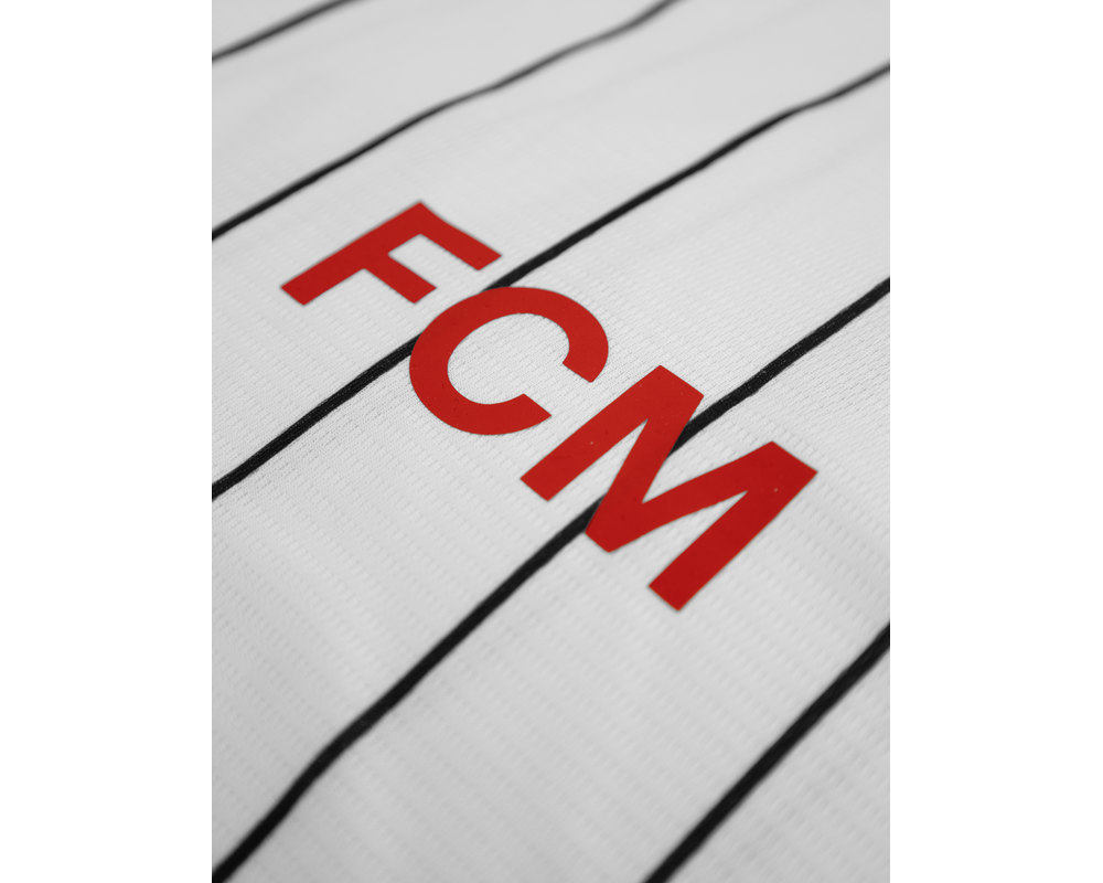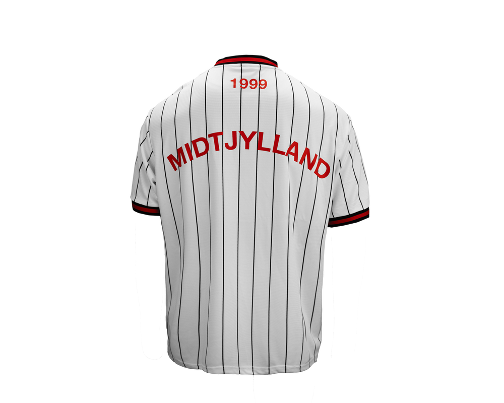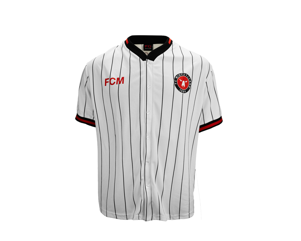 Klassisk baseball-inspireret trøje i hvid med sorte striber og røde FCM-detaljer. Designet har klublogo på brystet, “MIDTJYLLAND 1999” på ryggen og kontrastfarvede ribkanter for et sporty og stilrent udtryk. Lavet i let og åndbart materiale, der sikrer høj komfort til både hverdag og kampdag.