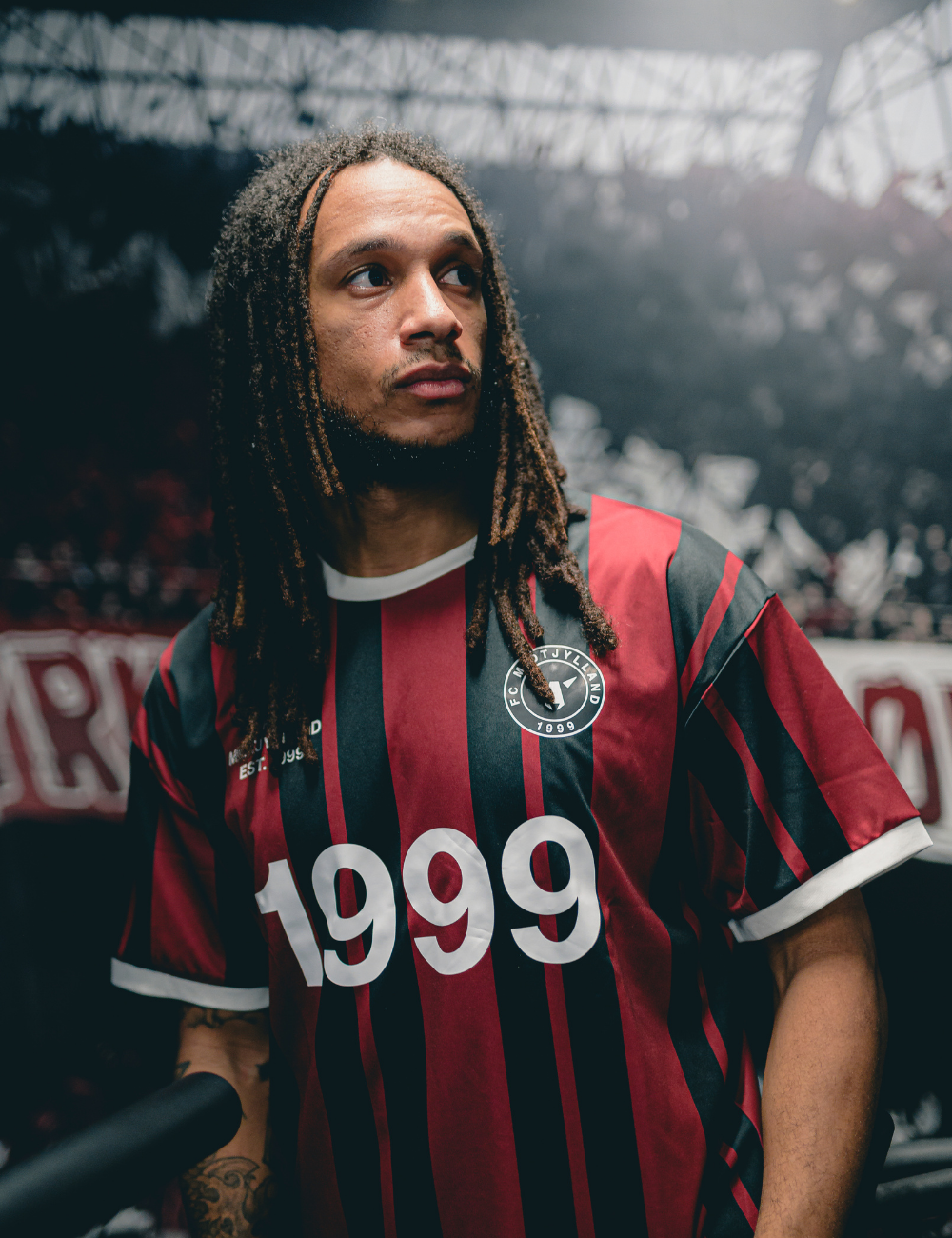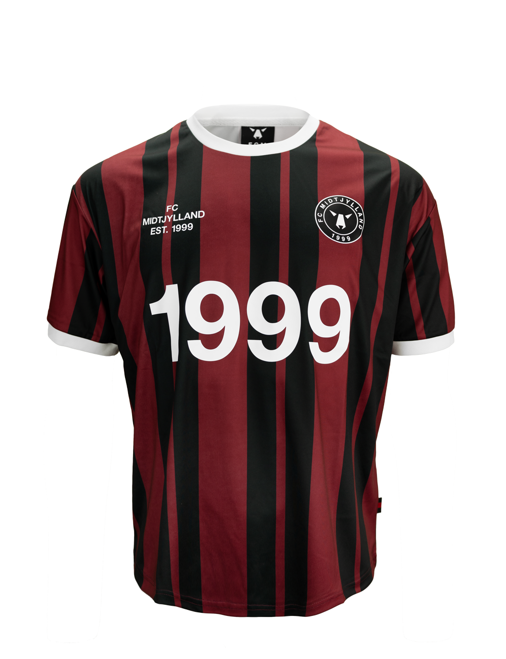Hyld FC Midtjyllands stiftelsesår med denne retro-inspirerede trøje i bordeaux og sort striber. Det store “1999”-tryk og klassiske FCM-logo giver et autentisk look, mens den bløde, åndbare kvalitet og hvide ribdetaljer ved hals og ærmer fuldender det tidløse design.