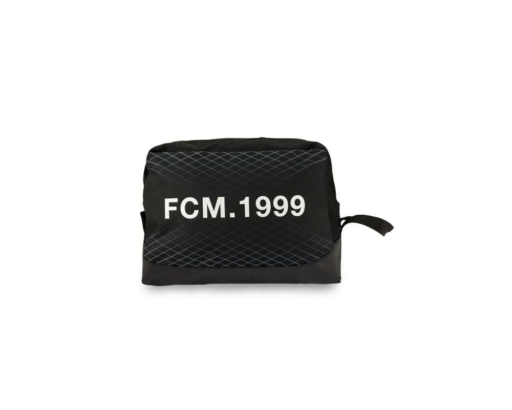 Praktisk sort toilettaske med F.C. Midtjylland-logo på den ene side og "FCM. 1999" på den anden. Tasken har lynlås og en lille hank, der gør den nem at tage med på farten. Perfekt til både hverdag og rejser!