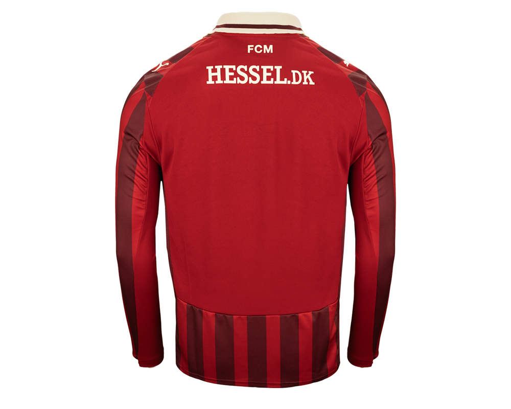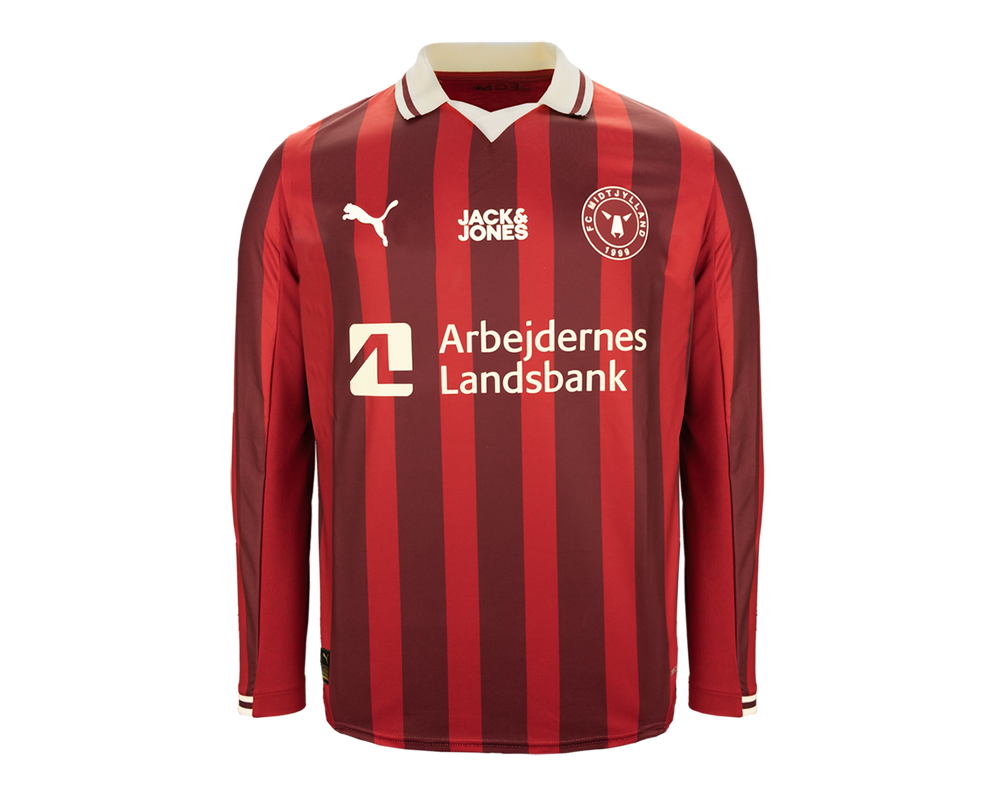 Tag den stolte FC Midtjylland-ånd med dig – uanset hvor du befinder dig – med den langærmet udebanetrøje for sæsonen 25/26. Denne stilrene trøje kombinerer klassisk design med elegante bordeaux striber i et unikt, sublimationsprintet design, der fremhæver klubbens karakter og tradition. Hver detalje er gennemtænkt – fra den lette og åndbare kvalitet, der sikrer maksimal komfort både på og uden for banen, til de præcise syninger, der giver et eksklusivt udtryk.