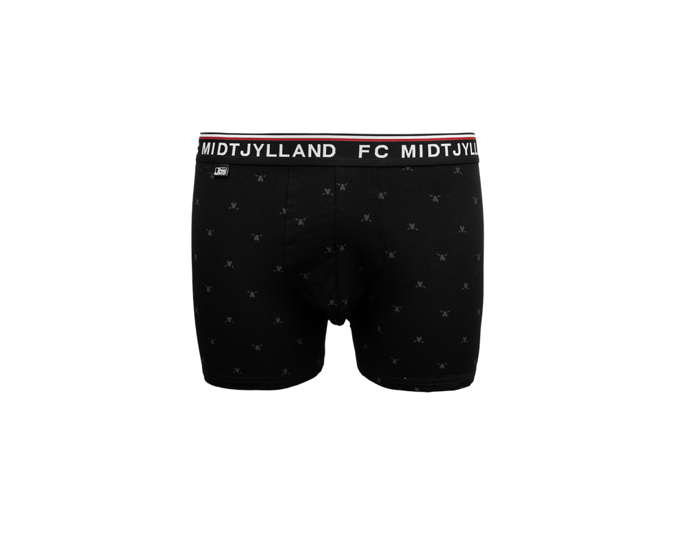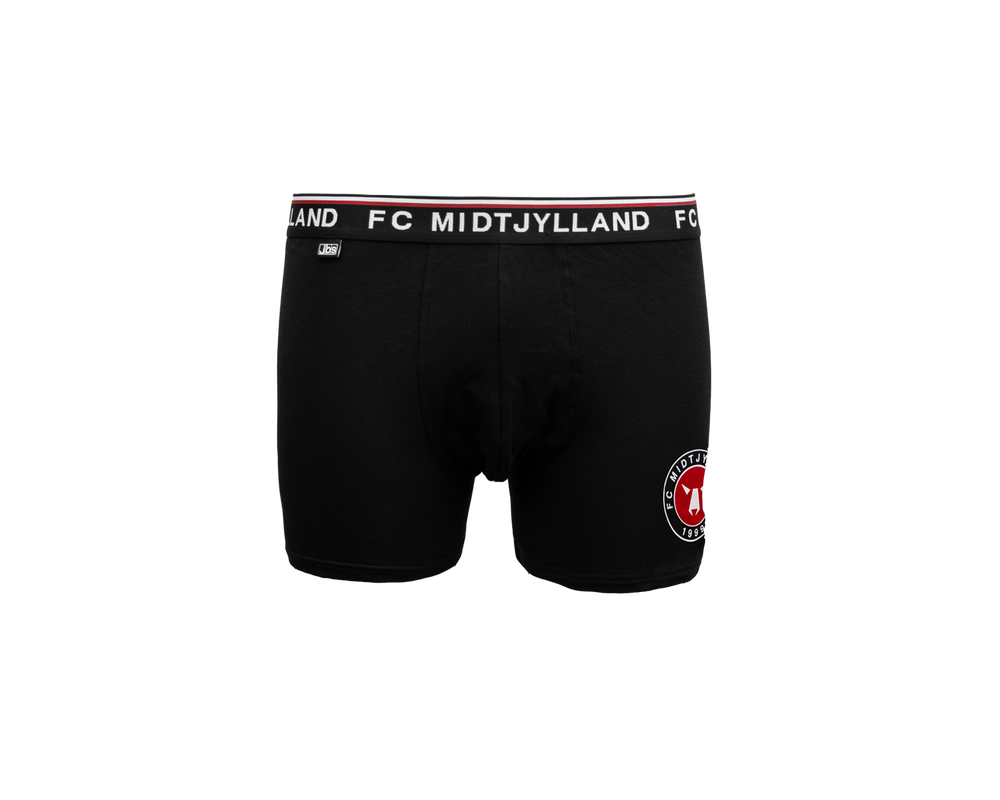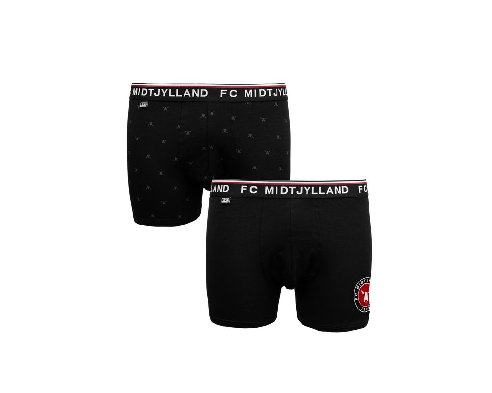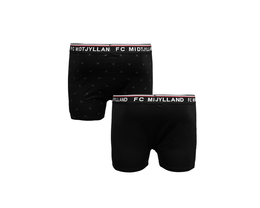 FC Midtjylland 2-pack underbukser med sort elastikkant og teksten FC MIDTJYLLAND på elastikken. Underbukserne er designet med fokus på komfort og har et elastisk bånd i livet, der sikrer en behagelig pasform hele dagen. Sættet indeholder et par med farvet FCM-logo og et par med mange små tone-i-tone ulvehoveder.