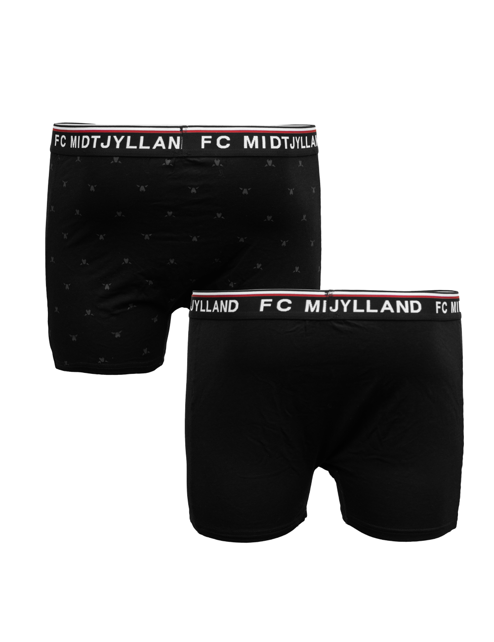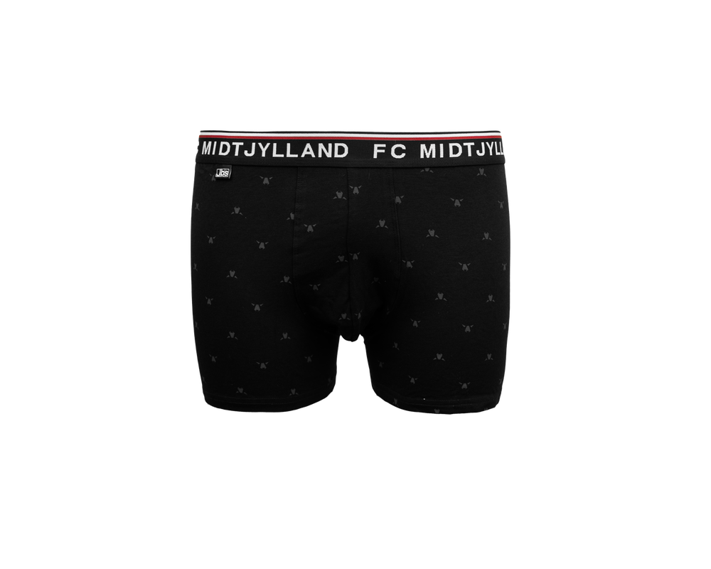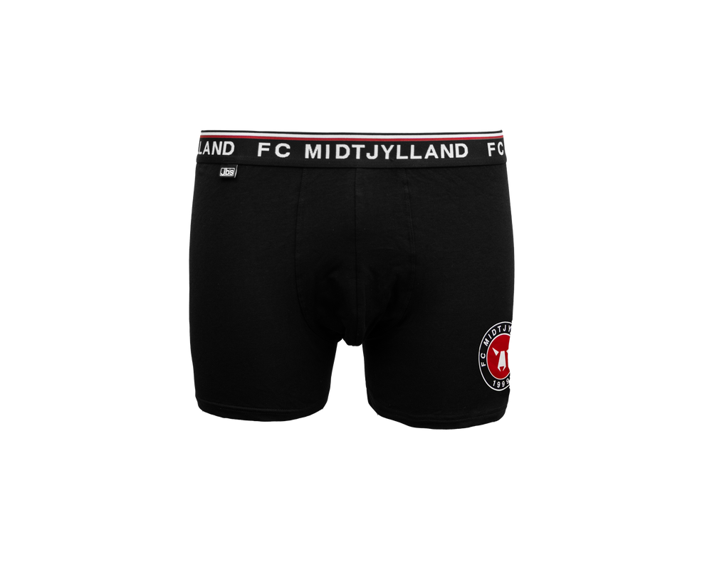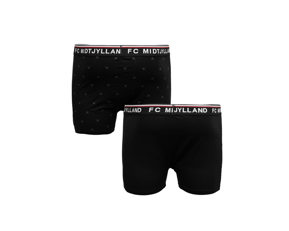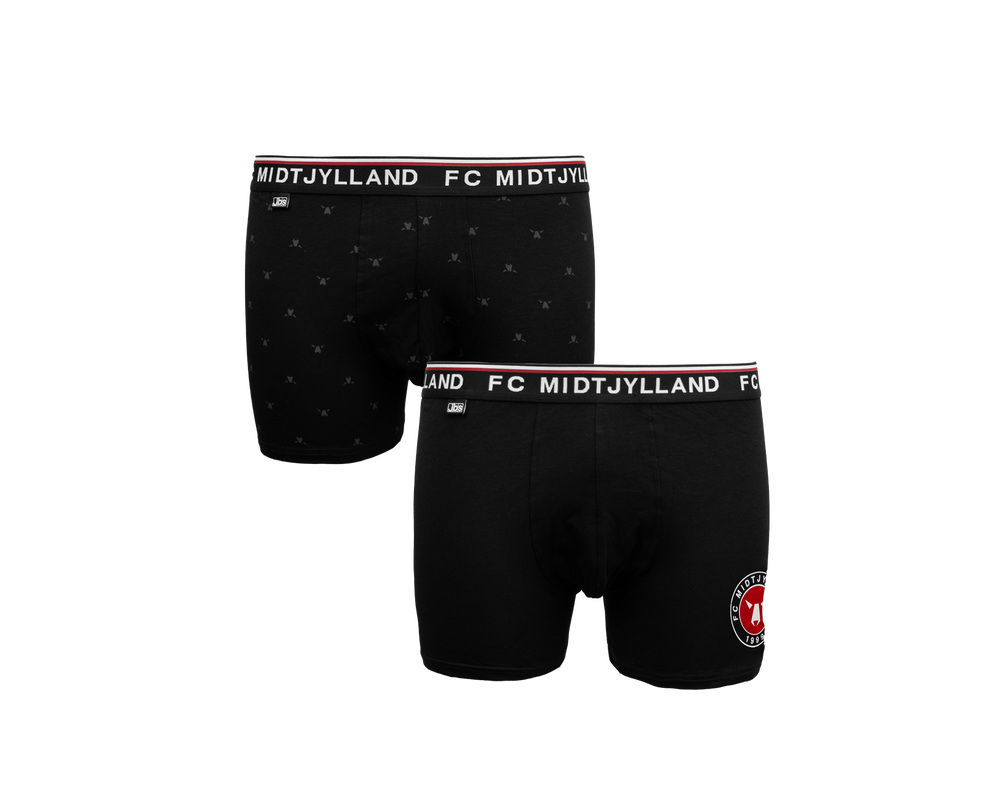 FC Midtjylland 2-pack underbukser med sort elastikkant og teksten FC MIDTJYLLAND på elastikken. Underbukserne er designet med fokus på komfort og har et elastisk bånd i livet, der sikrer en behagelig pasform hele dagen. Sættet indeholder et par med farvet FCM-logo og et par med mange små tone-i-tone ulvehoveder.