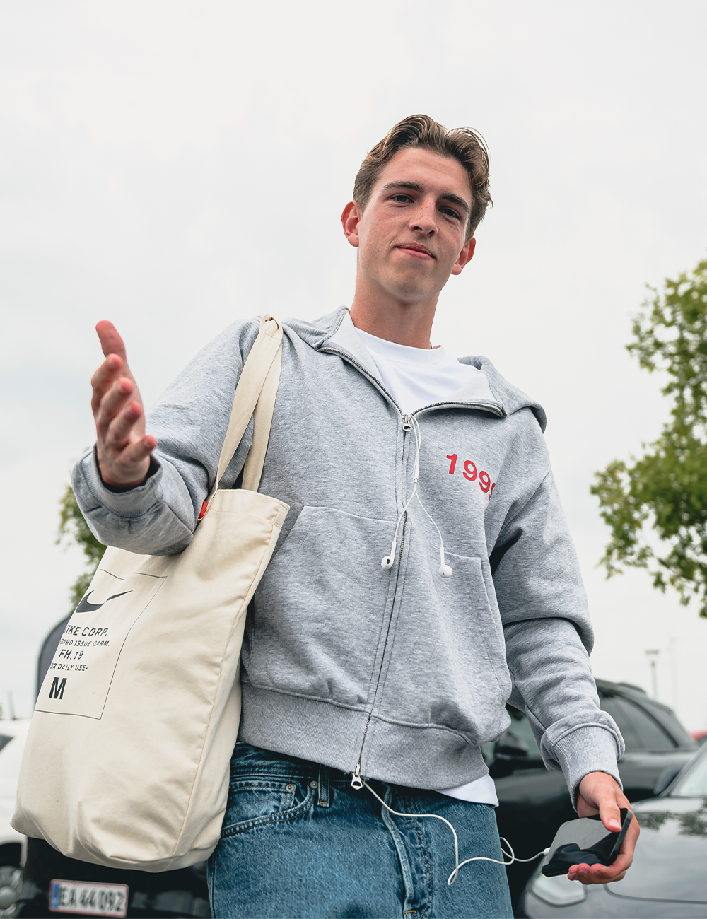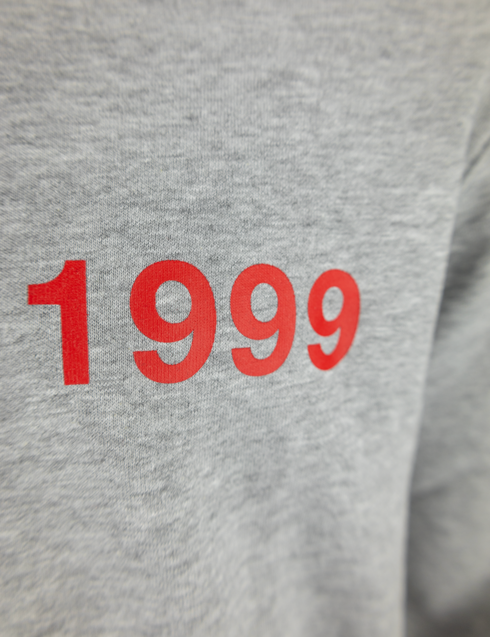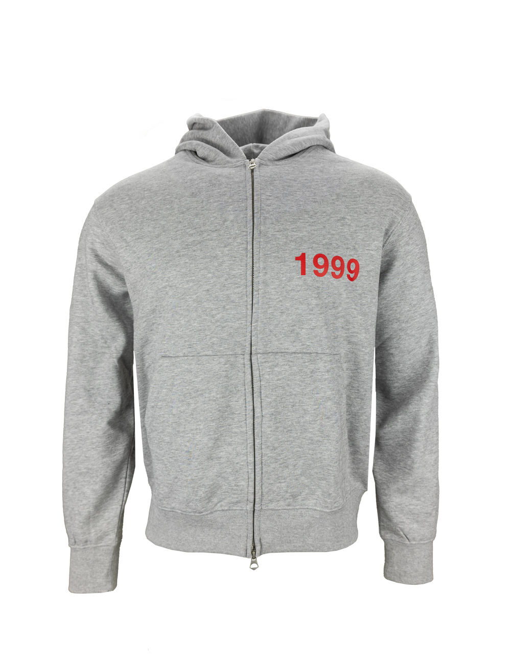 Lys grå hættetrøje med lynlås og '1999' trykt på brystet samt FCM på ryggen. Denne hættetrøje kombinerer stil og komfort med sit moderne design, perfekt til både afslapning og hverdagsbrug.