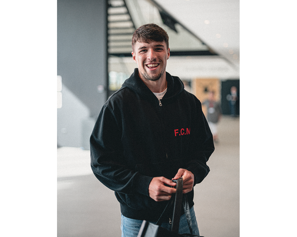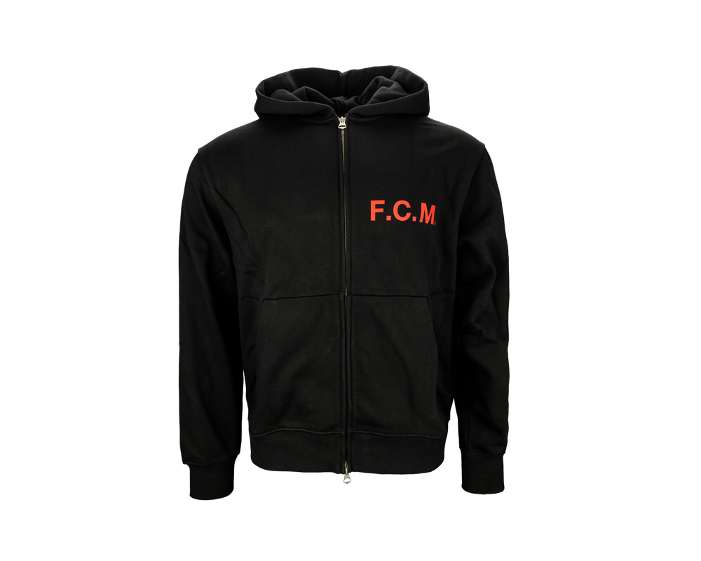 Sort hættetrøje med lynlås, udstyret med FCM-tryk på brystet og logo på ryggen. Denne hættetrøje kombinerer klubstolthed med komfort og stil, ideel til både afslapning og hverdagsbrug.