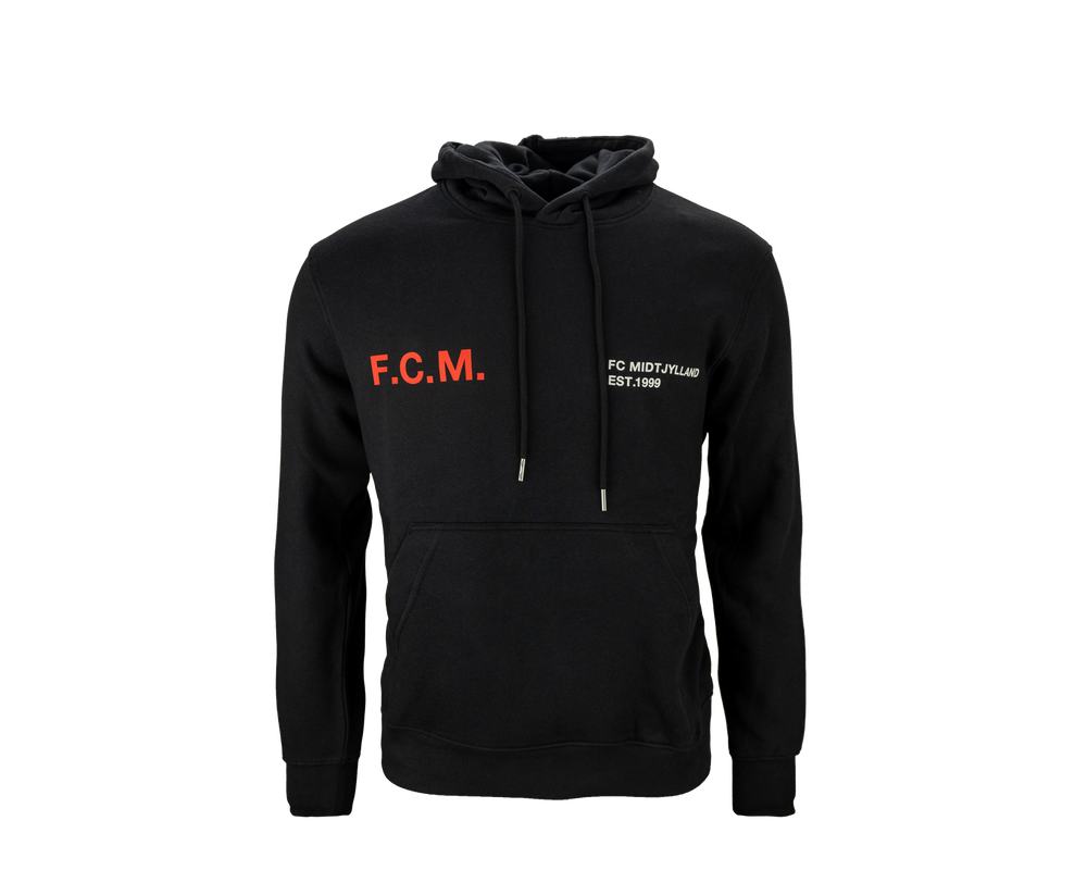 Sort hoodie med rød F.C.M. tekst på højre side af brystet og FC MIDTJYLLAND EST. 1999 på venstre side. Trøjen er designet med et stort FC Midtjylland logo på ryggen, så du til enhver tid kan vise din støtte til holdet, både til kampe og i hverdagen.
