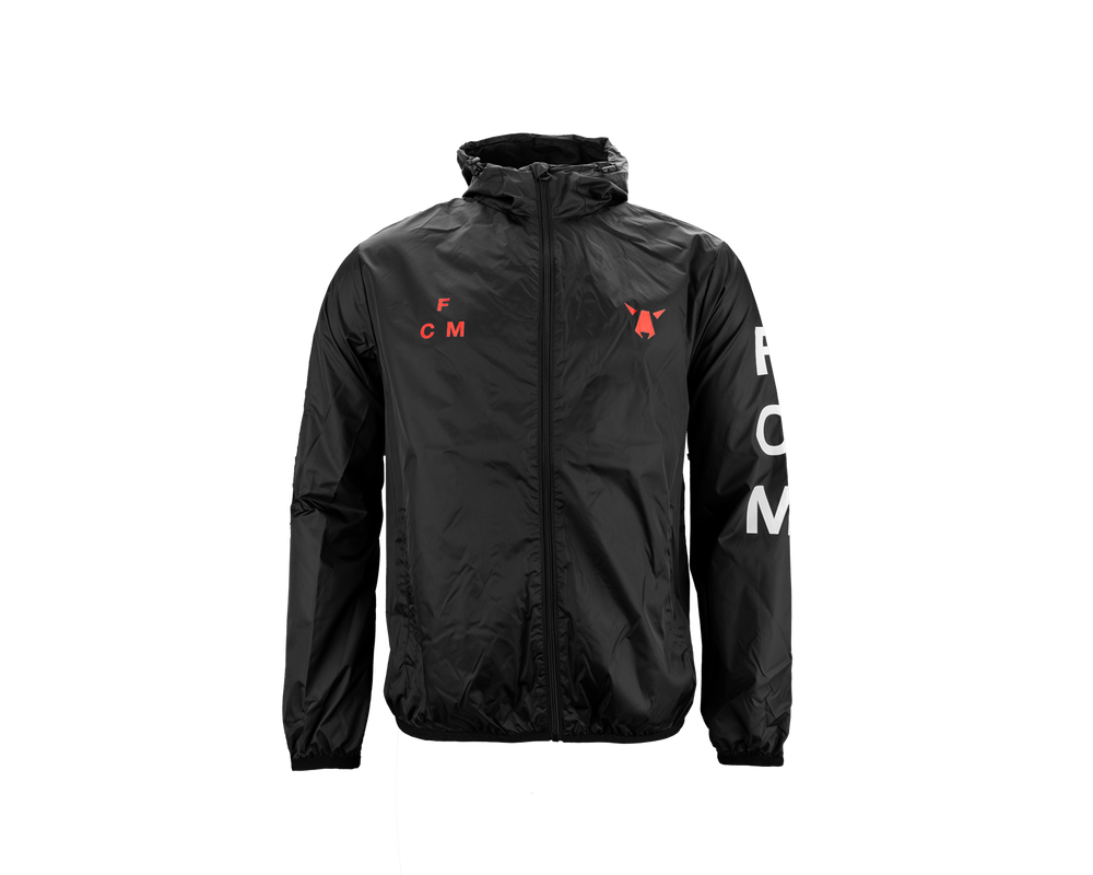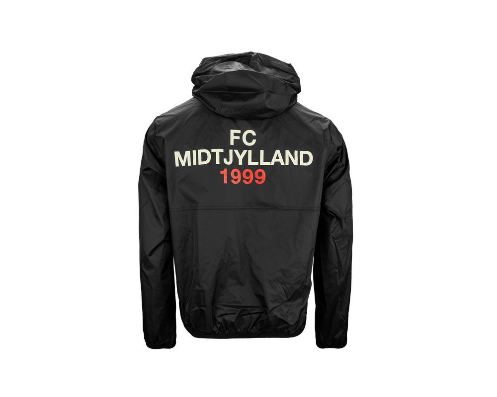 Sort windbreaker, der elegant kombinerer stil og klubånd. Med et rødt ulvelogo på det ene bryst og 'FCM' på det andet, samt 'FC Midtjylland' på ryggen, viser denne jakke din passion for klubben. Der står også 'FCM' på den ene arm, hvilket tilføjer en ekstra detalje. Denne windbreaker er ideel til at beskytte mod elementerne, samtidig med at dens enkle og stilfulde design gør den perfekt til både kampdage og hverdagsbrug. Bliv beskyttet mod vind og vejr, mens du stolt repræsenterer FC Midtjylland. Vask ved 40 grader. Produktspecifikationer: Hovedmateriale 100% Nylon Foring 100 polyester.
