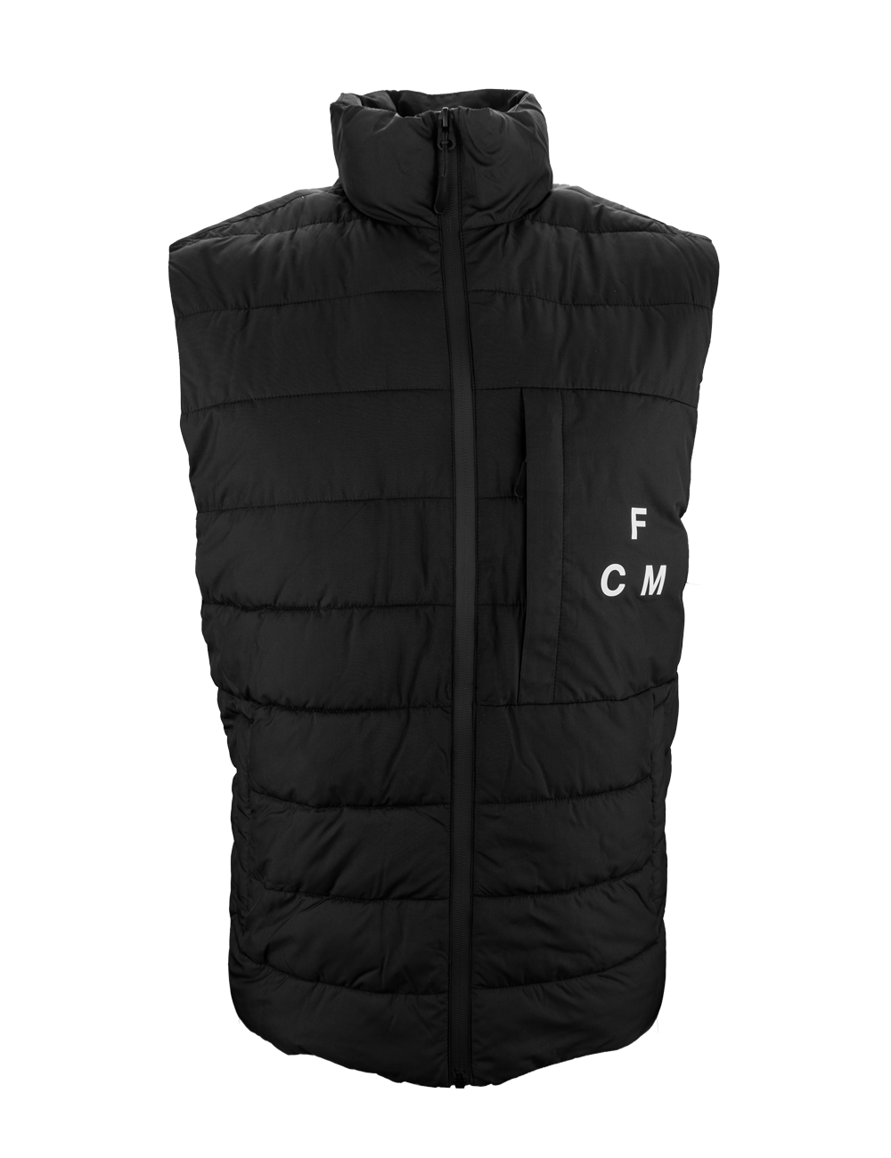 Sort quilted vest med FCM-tryk på brystet, designet til både stil og funktionalitet. Vestens quiltede materiale sikrer varme, mens de praktiske lommer og brystlommen giver dig mulighed for at opbevare dine essentials. Ideel til hverdagsbrug og kampdage, kombinerer denne vest klubstolthed med moderne design