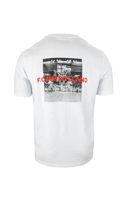 En stilren t-shirt med elegant F.C.M. tekst på højre side af brystet. Dertil er denne t-shirt designet med et lille ulvehoved fra det officielle FC Midtjylland logo i nakken som fuldender looket.