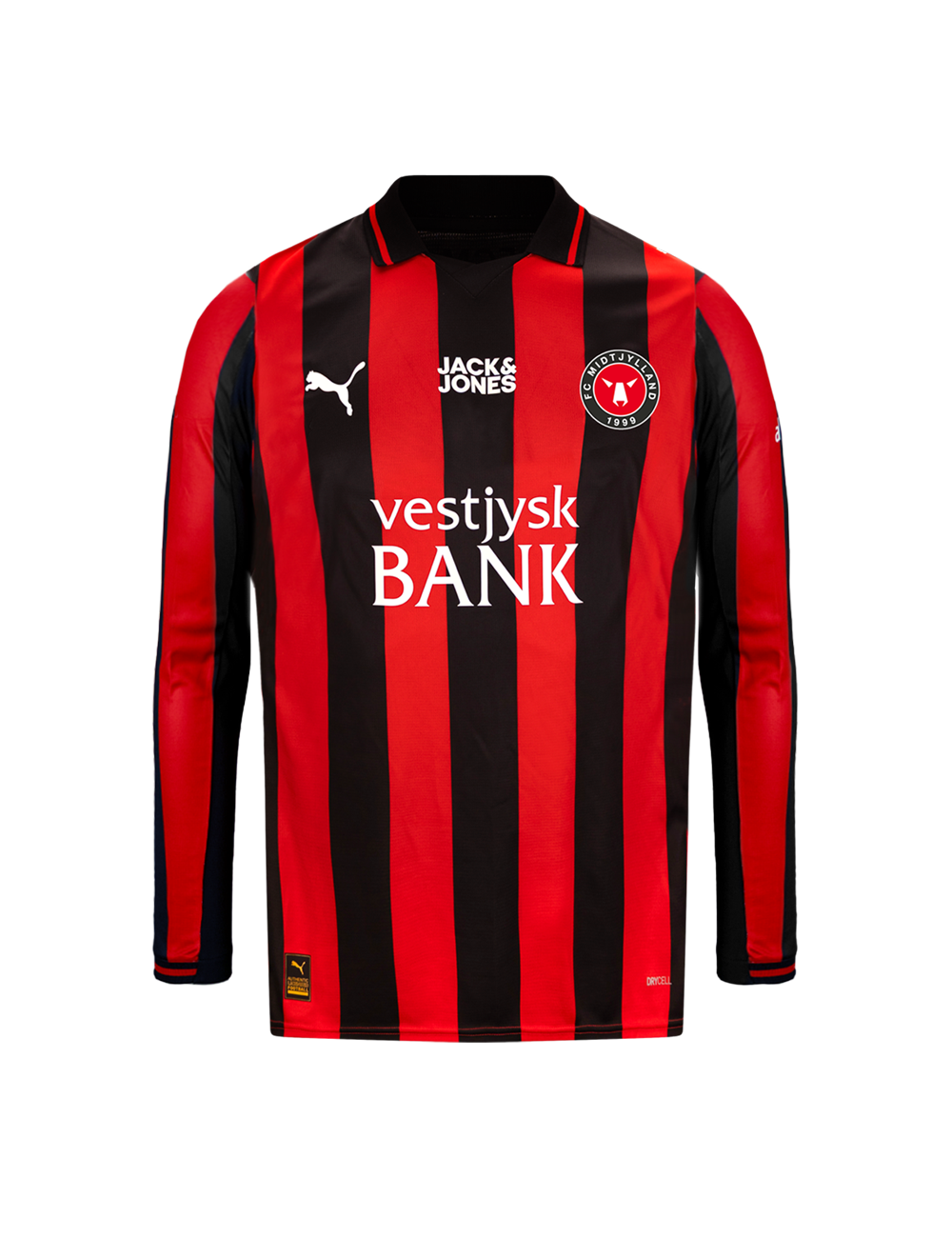 Hjemmebanetrøjen 25/26 er stribet i rød og sort – en farvekombination, der tydeligt signalerer FC Midtjyllands identitet både på og uden for banen. Trøjen er skabt i tæt samarbejde mellem FC Midtjylland og PUMA med ét klart formål: at give spillerne de bedste betingelser for at præstere på allerhøjeste niveau og samtidig inspirere fans i hele regionen. I designprocessen har det været essentielt at fastholde klubbens vilje til fornyelse, samtidig med at vi ærer vores rødder.