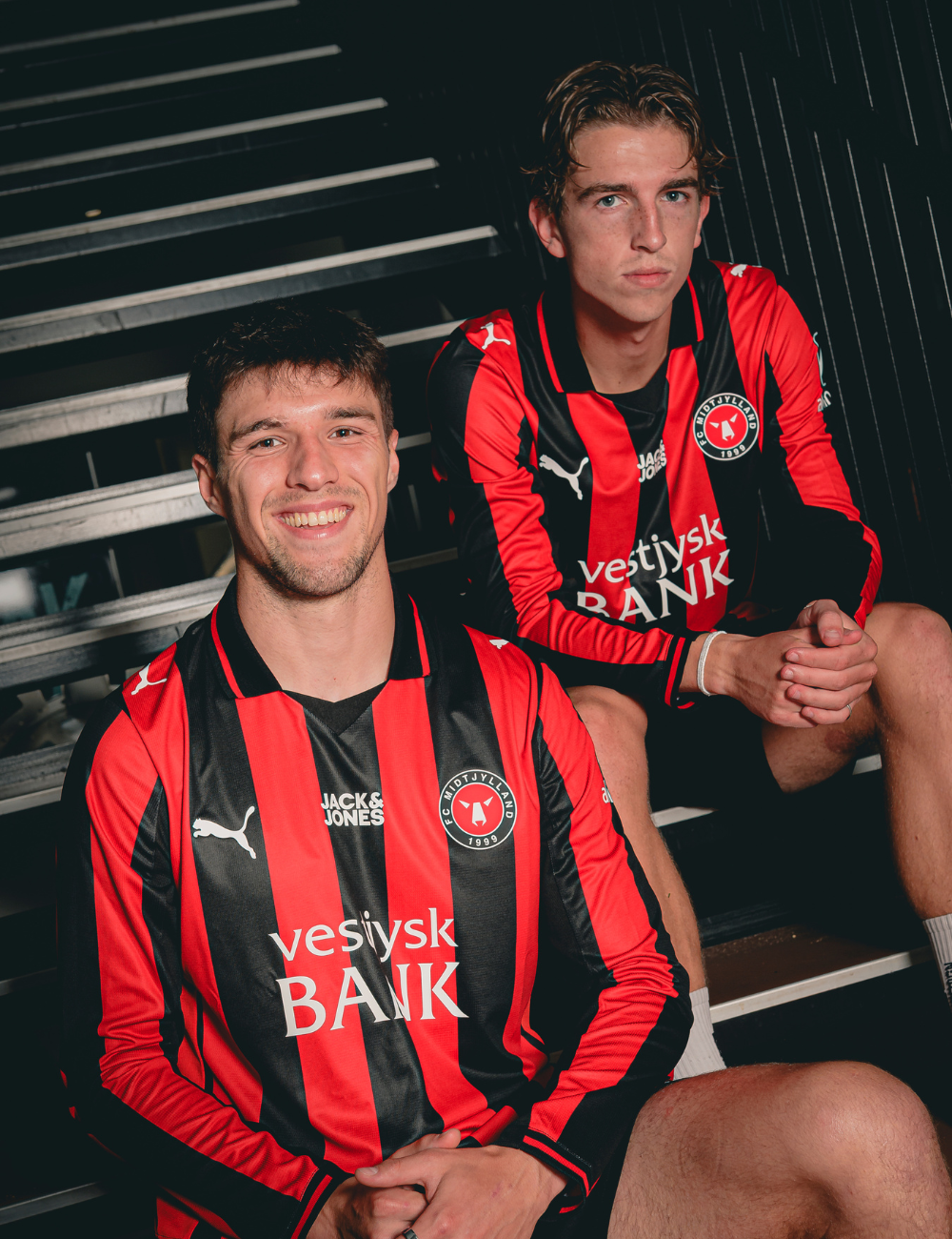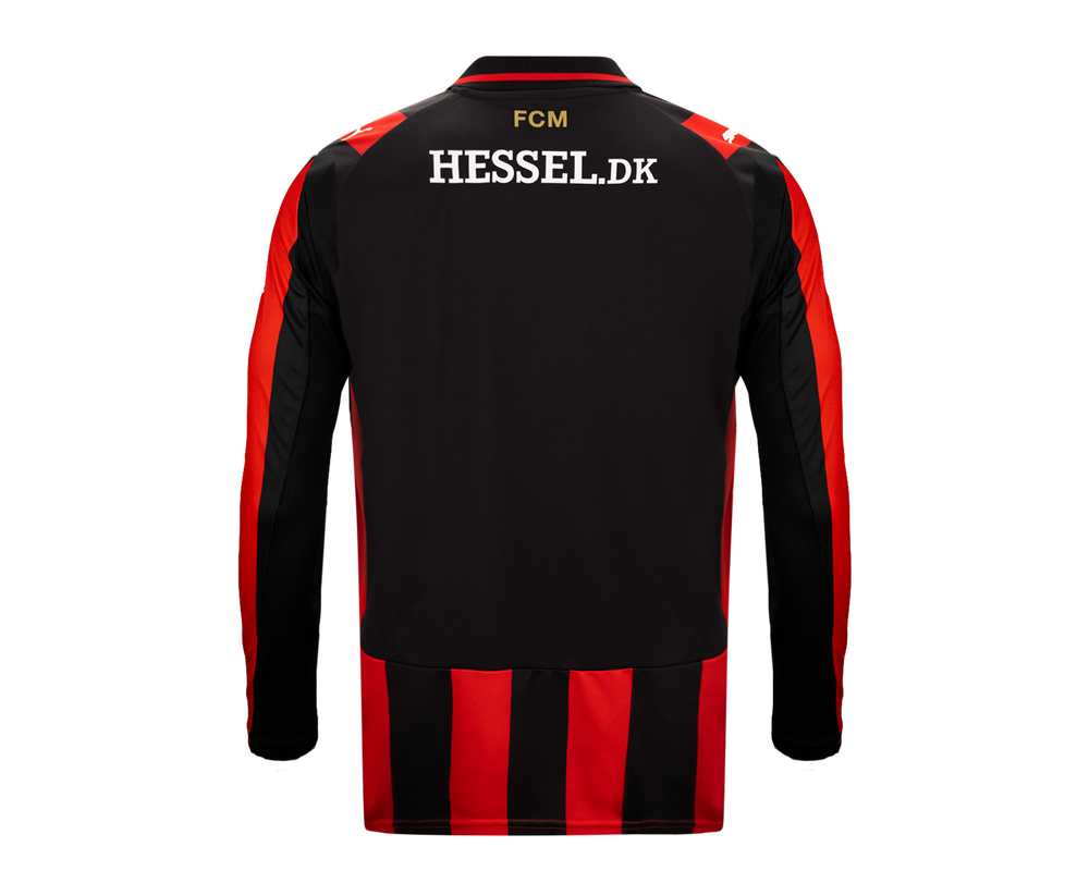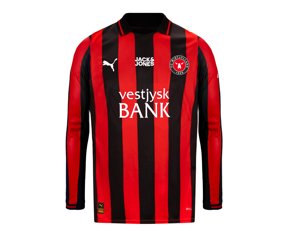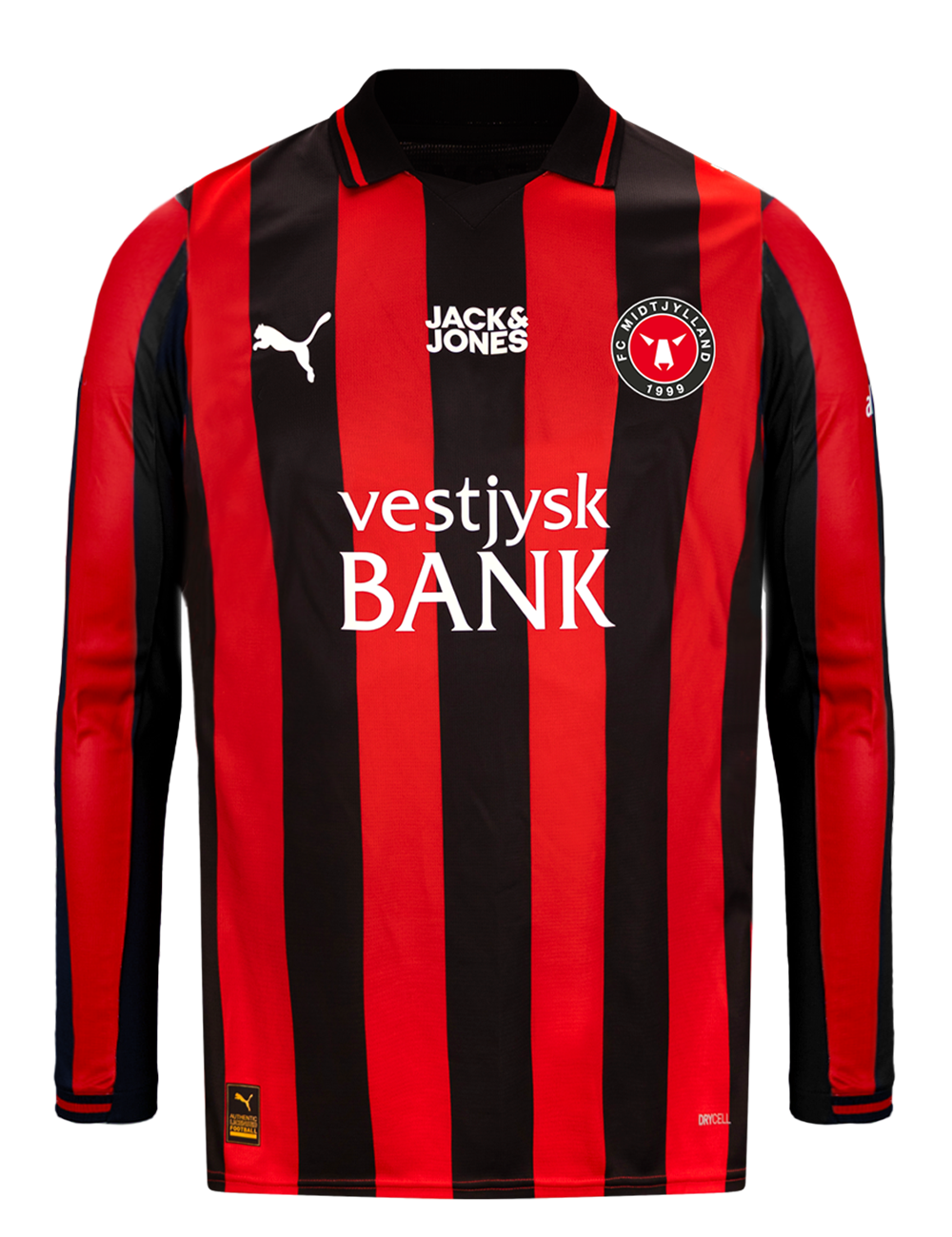 Hjemmebanetrøjen 25/26 er stribet i rød og sort – en farvekombination, der tydeligt signalerer FC Midtjyllands identitet både på og uden for banen. Trøjen er skabt i tæt samarbejde mellem FC Midtjylland og PUMA med ét klart formål: at give spillerne de bedste betingelser for at præstere på allerhøjeste niveau og samtidig inspirere fans i hele regionen. I designprocessen har det været essentielt at fastholde klubbens vilje til fornyelse, samtidig med at vi ærer vores rødder.