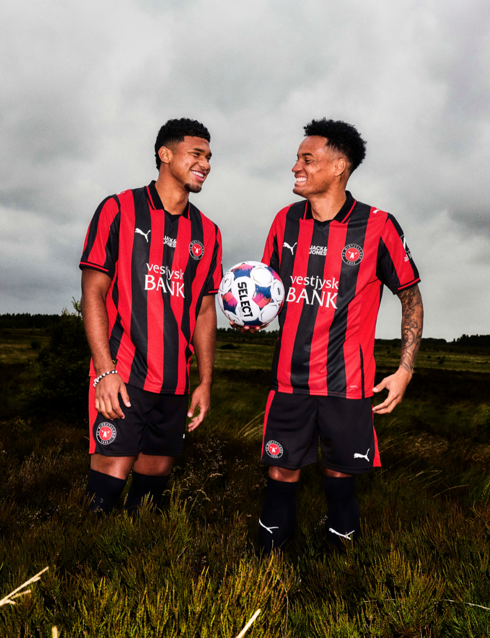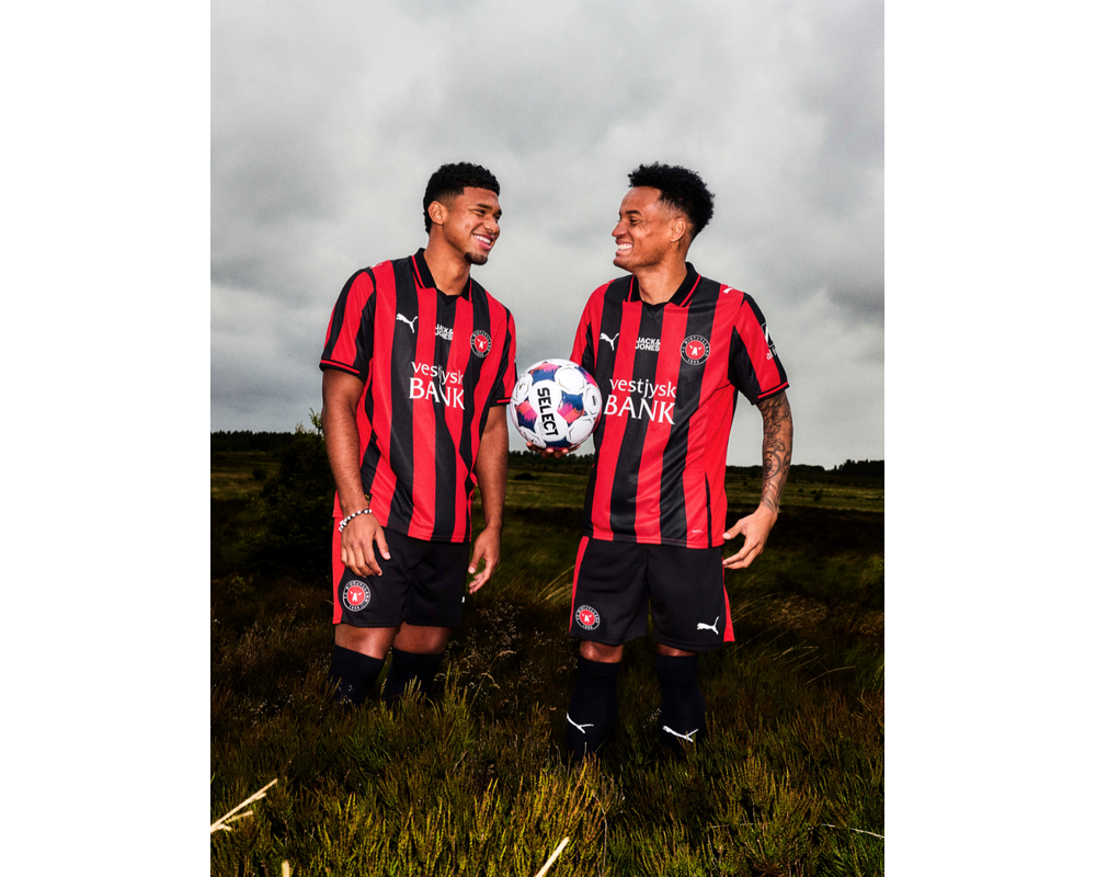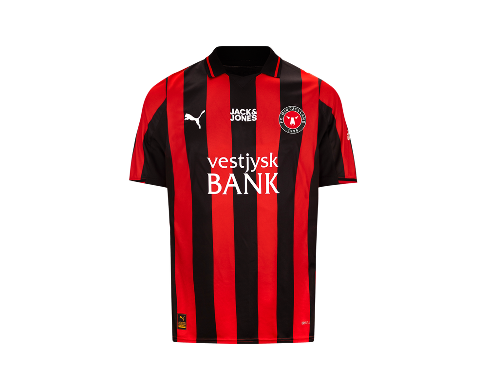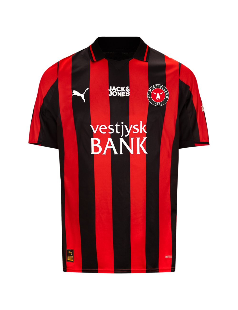 Hjemmebanetrøjen 25/26 er stribet i rød og sort – en farvekombination, der tydeligt signalerer FC Midtjyllands identitet både på og uden for banen. Trøjen er skabt i tæt samarbejde mellem FC Midtjylland og PUMA med ét klart formål: at give spillerne de bedste betingelser for at præstere på allerhøjeste niveau og samtidig inspirere fans i hele regionen. I designprocessen har det været essentielt at fastholde klubbens vilje til fornyelse, samtidig med at vi ærer vores rødder.