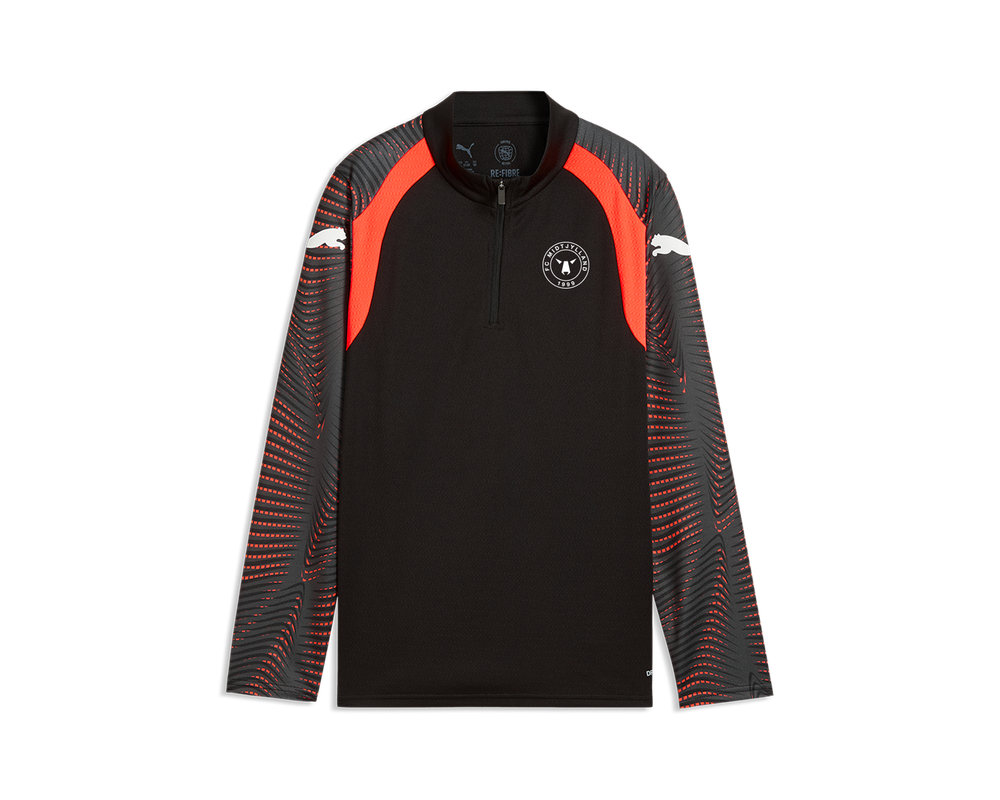 Denne langærmede træningstrøje er designet til høj intensitet og komfort. Den praktiske kvartlange lynlås giver mulighed for justering og ventilation under træning, mens den normale pasform sikrer god bevægelsesfrihed. Det ikoniske FC Midtjylland-logo på brystet fuldender udtrykket og understreger klubbens identitet.