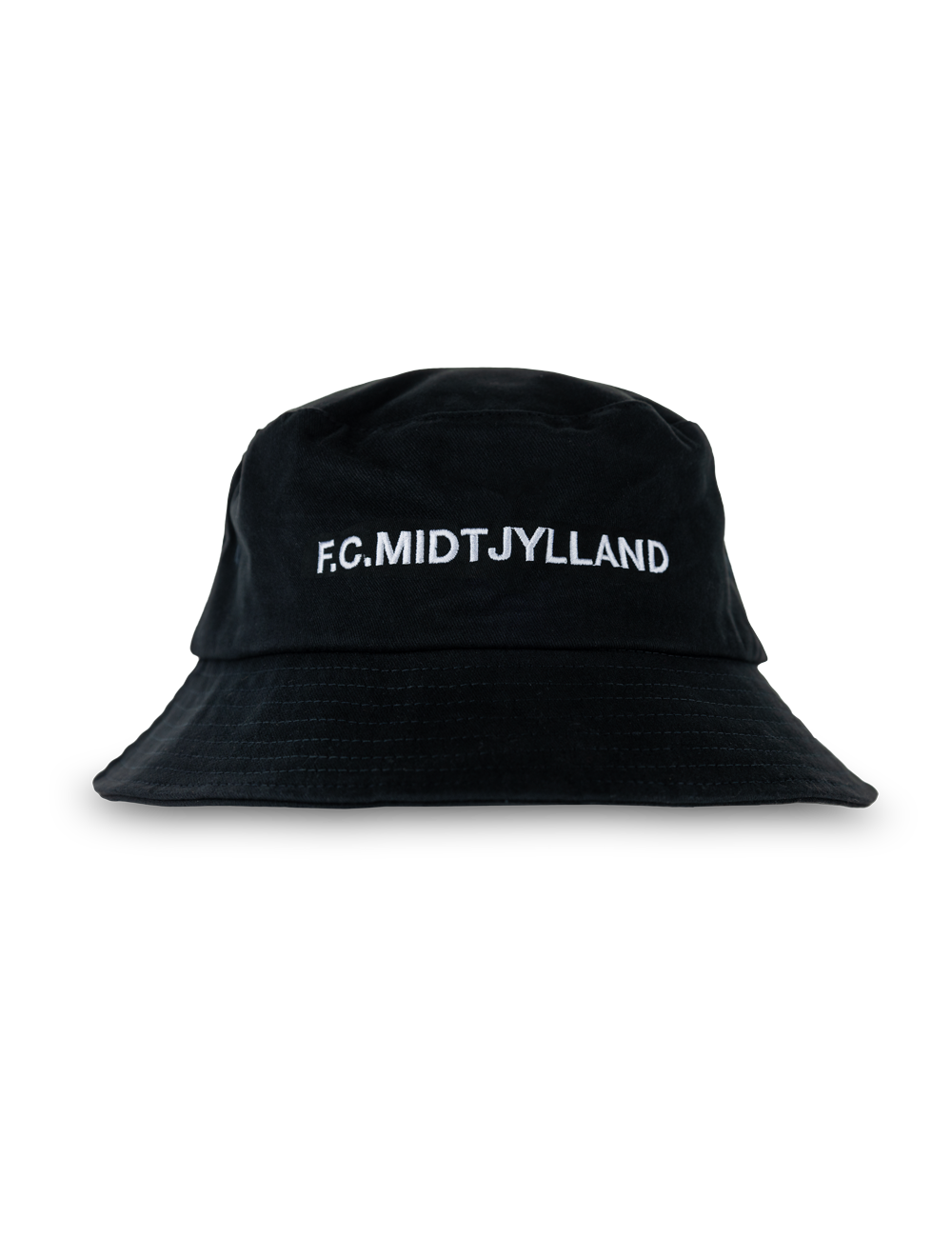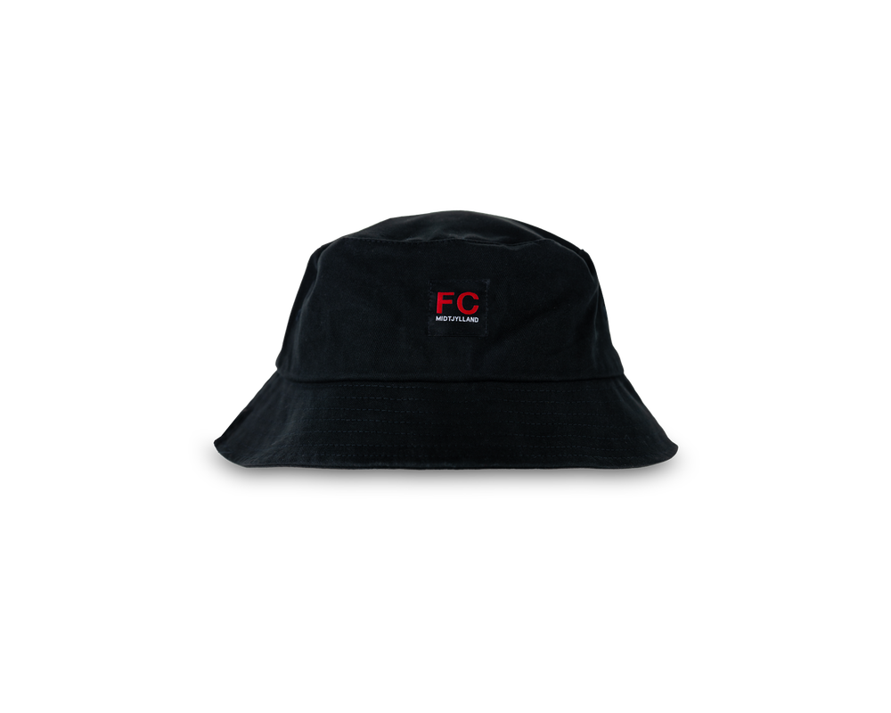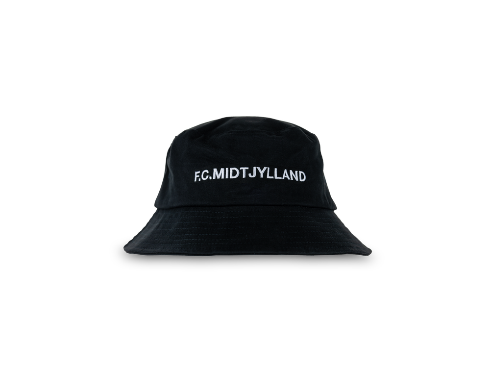 Sort bøllehat med teksten 'F.C. Midtjylland' på den ene side og et lille FC Midtjylland-tag på den anden side. Perfekt til at vise din klubstolthed med stil, samtidig med at du beskytter dig mod solen. En moderne og funktionel tilføjelse til din FC Midtjylland-garderobe.