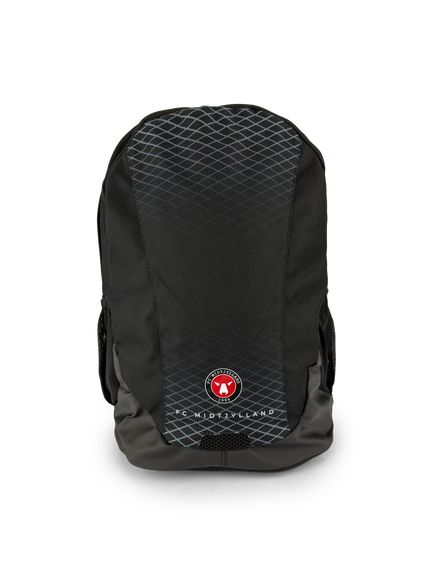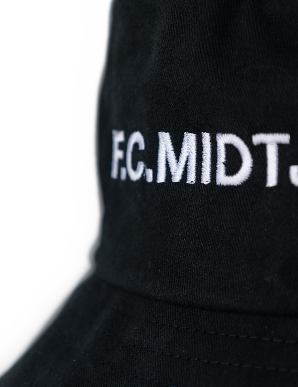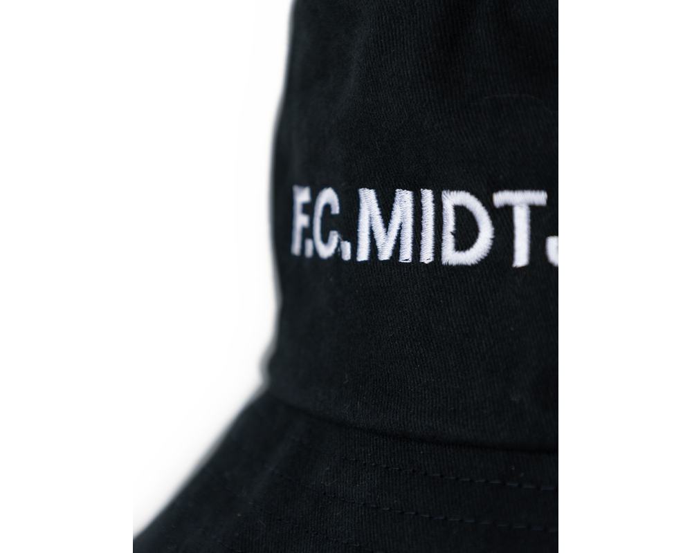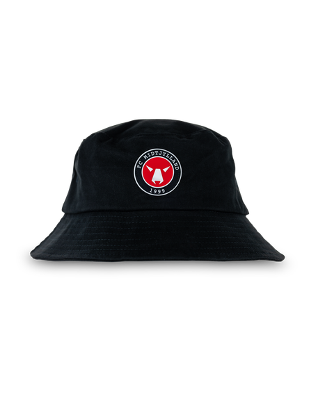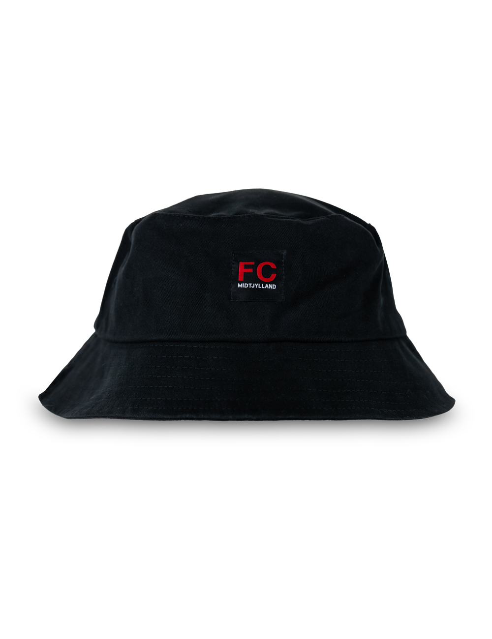 Sort bøllehat med teksten 'F.C. Midtjylland' på den ene side og et lille FC Midtjylland-tag på den anden side. Perfekt til at vise din klubstolthed med stil, samtidig med at du beskytter dig mod solen. En moderne og funktionel tilføjelse til din FC Midtjylland-garderobe.