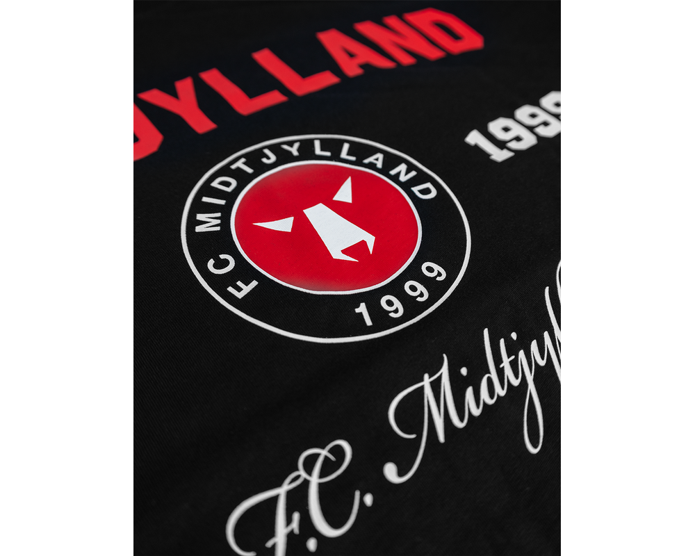 Denne T-shirt i sort er designet i et stilfuldt design, med et FCM logo central på fronten, herover har den "MIDTJYLLAND" skrevet. T-shirten er fremstillet i blødt og behageligt materiale, der giver en komfortabel pasform hele dagen.