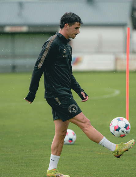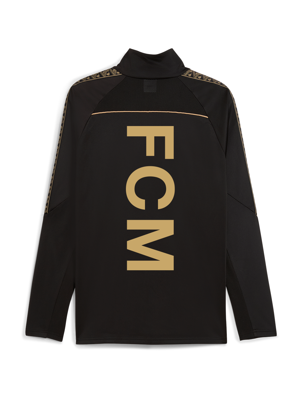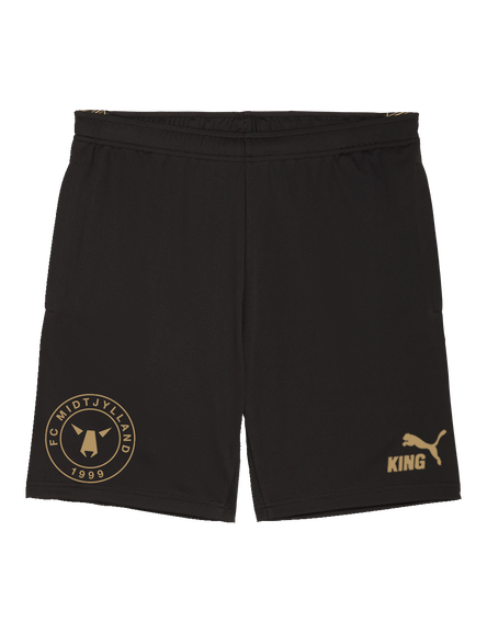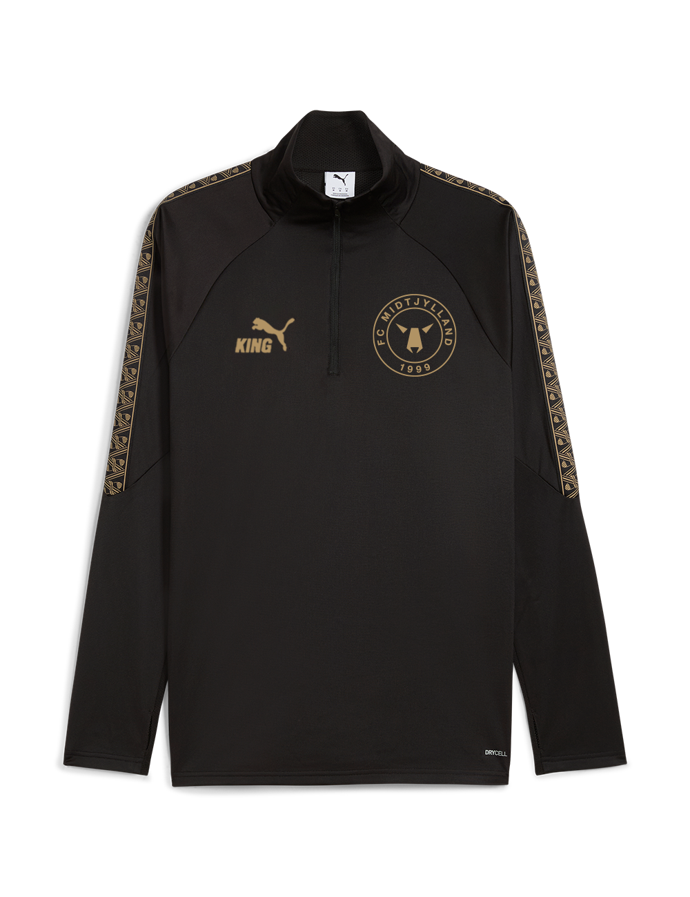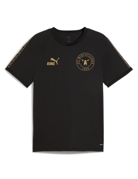 PUMA KING Training midlayer er skabt til spilleren, der kræver både funktion og stil. Den er en del af PUMAs internationale topserie og designet med PUMA dryCELL-teknologi – et åndbart, hurtigtørrende materiale, der effektivt leder fugt væk fra kroppen, så du holdes tør og komfortabel under hele træningen. Det sorte design med elegante detaljer i en beige farve fremhæves af FC Midtjyllands logo på venstre bryst og et markant "FCM" tryk på ryggen.