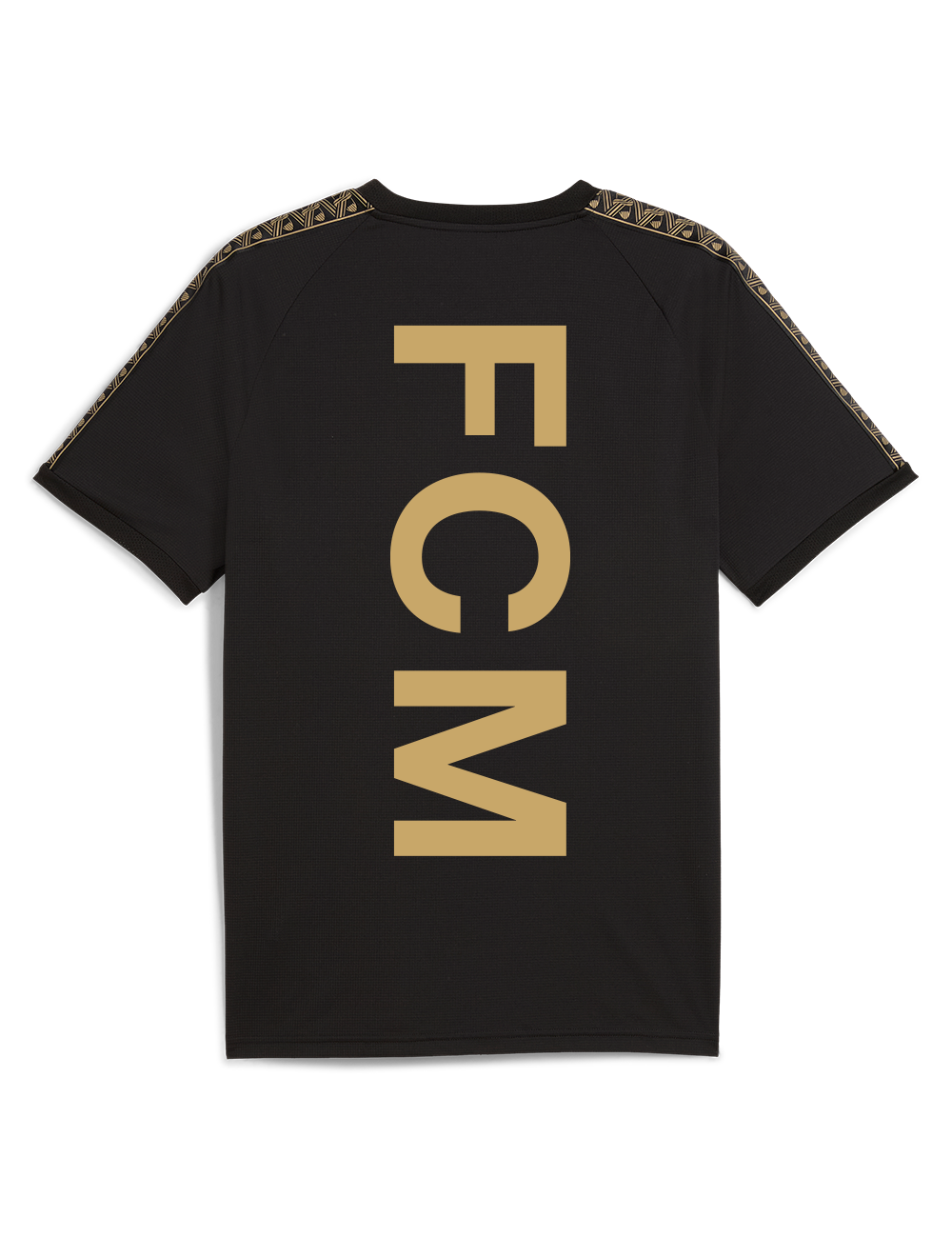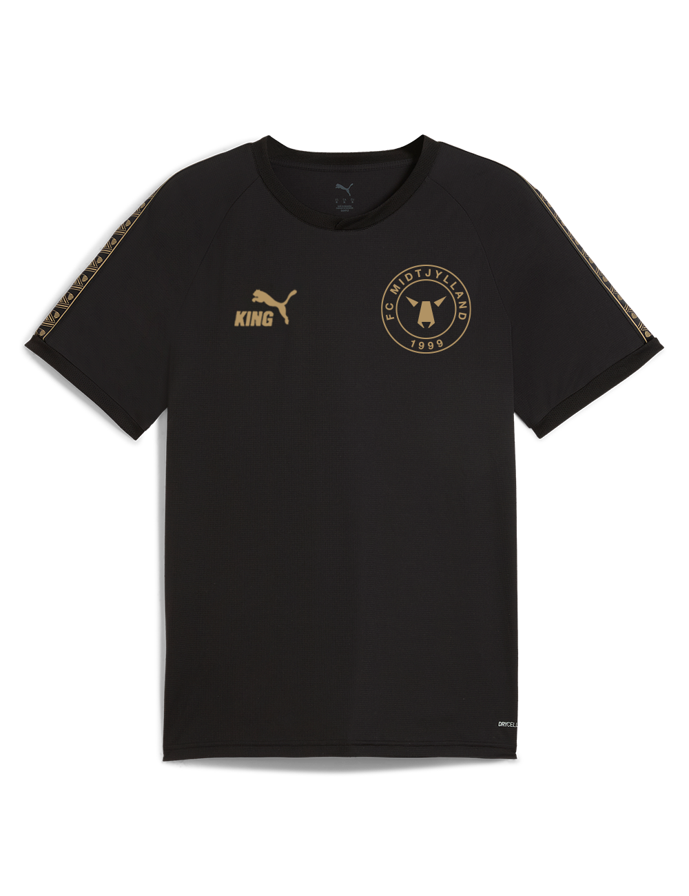 PUMA KING Training t-shirten er skabt til dig, der ønsker en stilren og komfortabel træningstrøje i høj kvalitet. Som en del af PUMAs internationale topserie forener den det bedste fra moderne sportstøj med et tidløst design. Det lette og åndbare materiale følger dine bevægelser – uanset om du er på træningsbanen eller i hverdagen. Designet er holdt i elegant sort med detaljer i en beige farve, og prydes af et markant FC Midtjylland-logo på venstre bryst samt en iøjnefaldende "FCM"-skrift på ryggen.