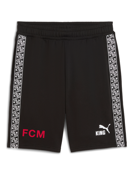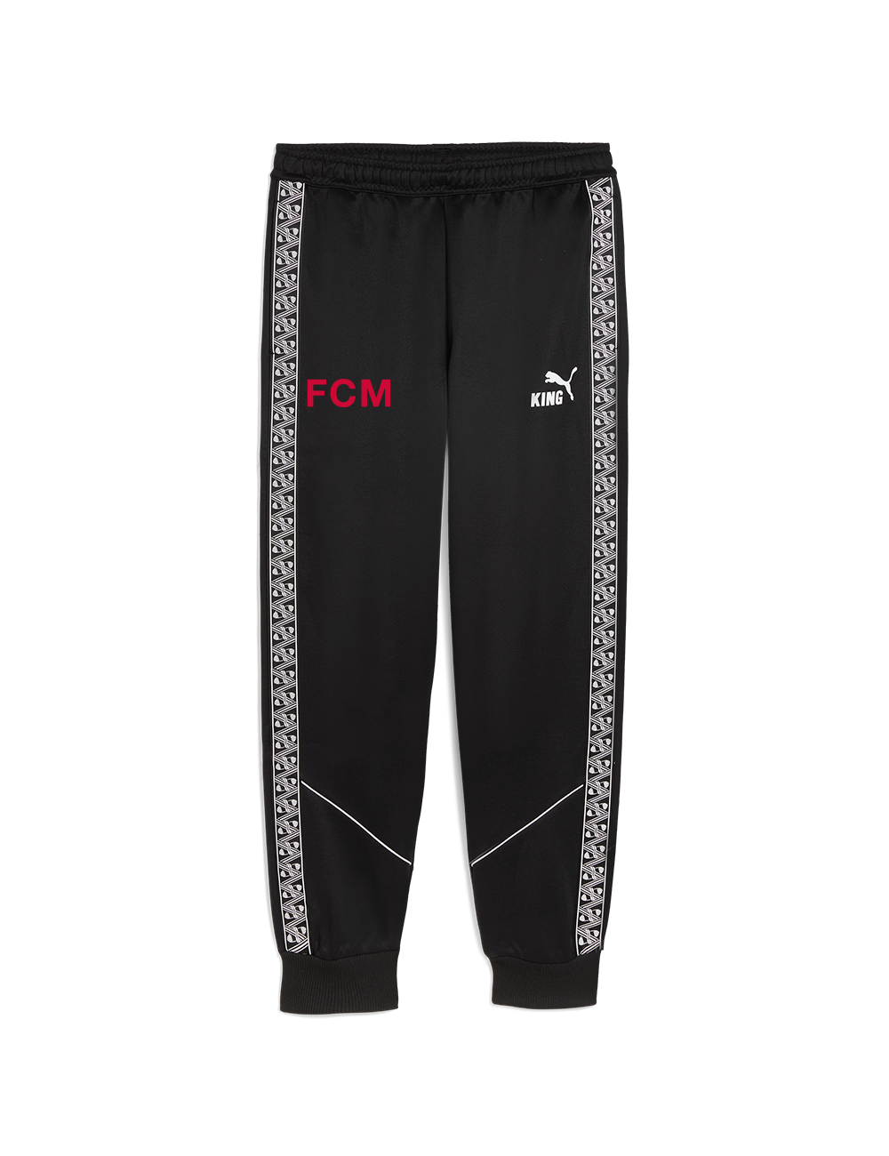 Gør dine hverdagsrejser og fritidsdage mere stilfulde med KING Travel Bukserne fra Puma – en kombination af sportslig komfort og moderne design. Bukserne er udført i et klassisk sort look med mønstrede detaljer langs buksebenene, der tilfører et unikt og dynamisk udtryk med "FCM" skrevet med rød skrift på det ene bukseben.