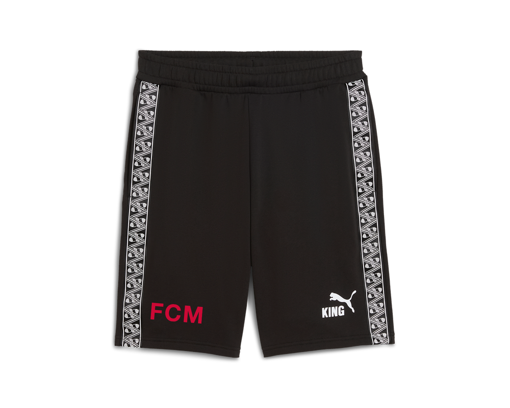 Gør dine hverdagsrejser og fritidsdage mere stilfulde med KING Travel Shorts fra Puma – en kombination af sportslig komfort og moderne design. Shortsene kommer i et klassisk sort look med mønstrede detaljer langs benene, der skaber et unikt og dynamisk udtryk med "FCM" er skrevet med rød skrift på det ene ben.