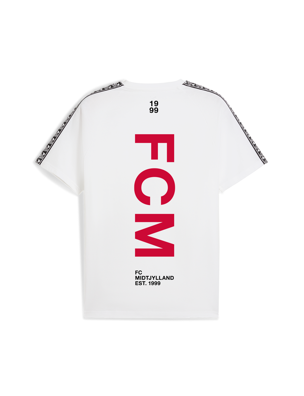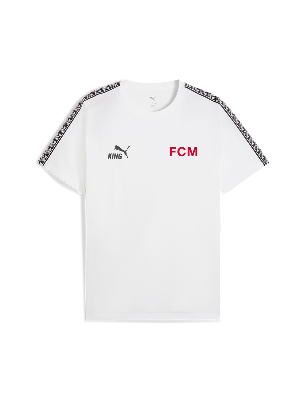 Puma King Travel T-shirten til børn er skabt til afslappet komfort og stil i hverdagen. Som en del af Pumas internationale tomserie er designet holdt rent og moderne, med elegante detaljer langs sideærmerne, der løfter udtrykket uden at virke prangende. T-shirten er lavet i blødt og åndbart bomuldsstof, og på venstre bryst finder du et diskret men markant "FCM"-tryk i rød – så du kan bære klubbens initialer med stolthed, uanset hvor du er.