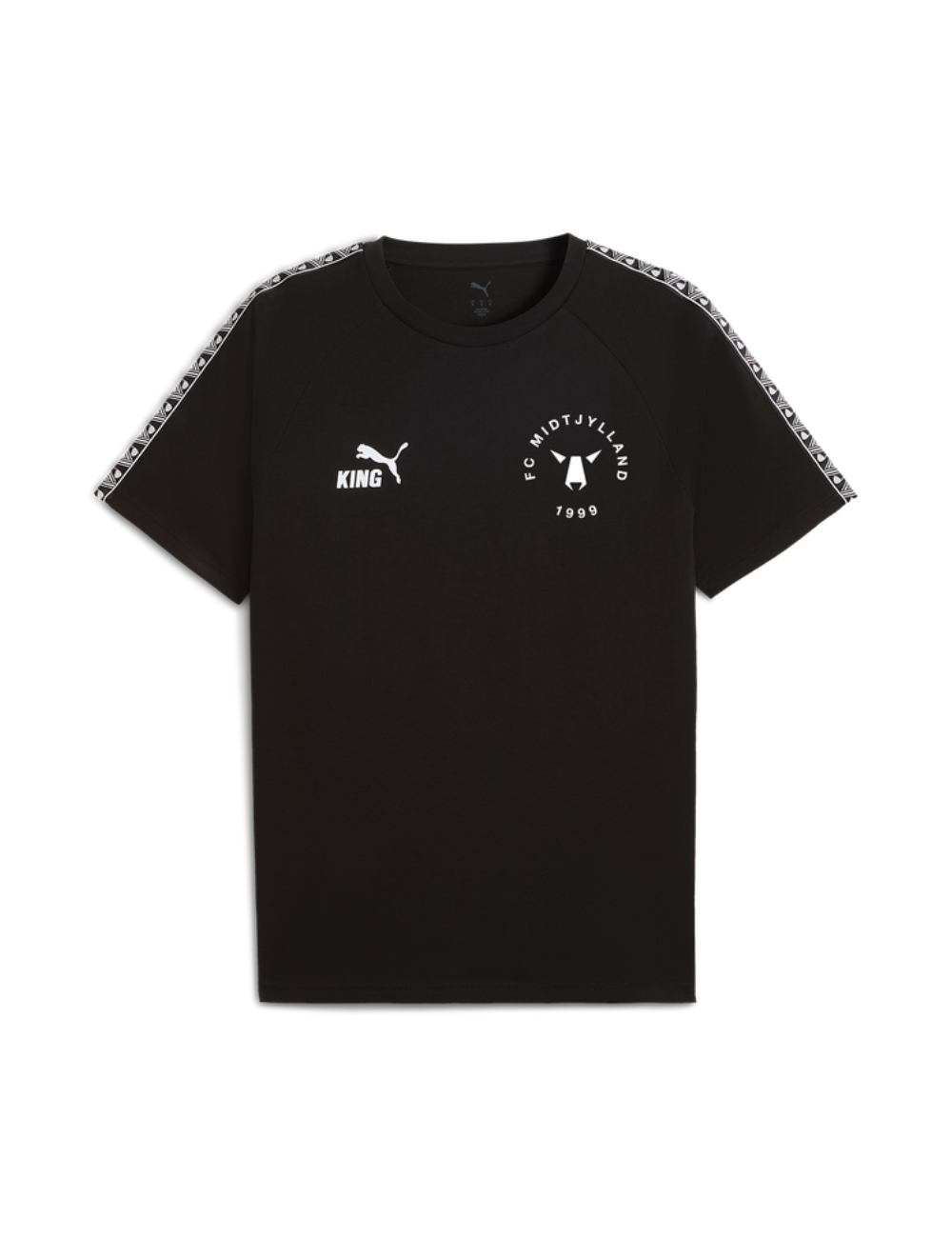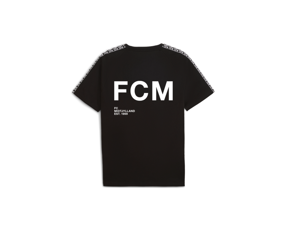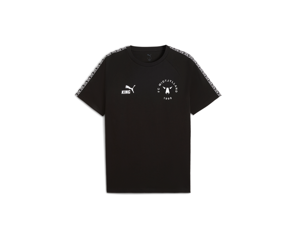 Puma King Travel T-shirten til børn i sort er skabt til afslappet komfort og stil i hverdagen. Som en del af Pumas internationale topserie er designet holdt rent og moderne, med elegante detaljer langs sideærmerne, der løfter udtrykket uden at virke prangende. T-shirten er lavet i blødt og åndbart bomuldsstof og prydes af et unikt FCM-logo på venstre bryst – et diskret, men markant design, der lader dig bære klubbens ånd med stolthed, uanset hvor du er.