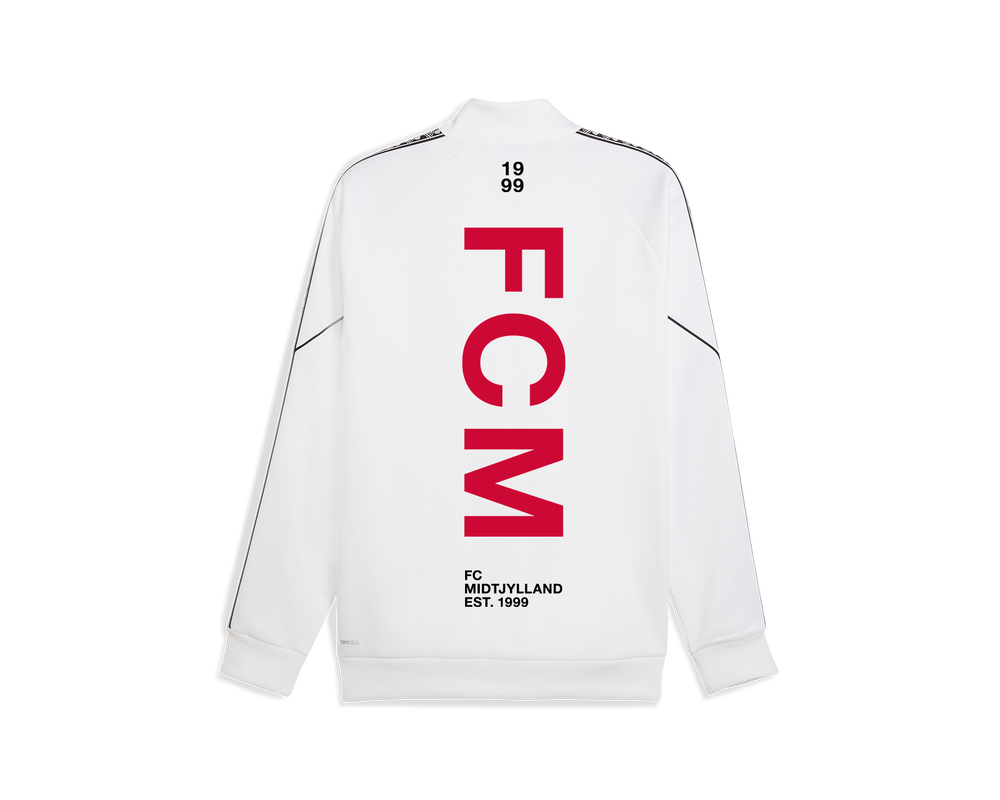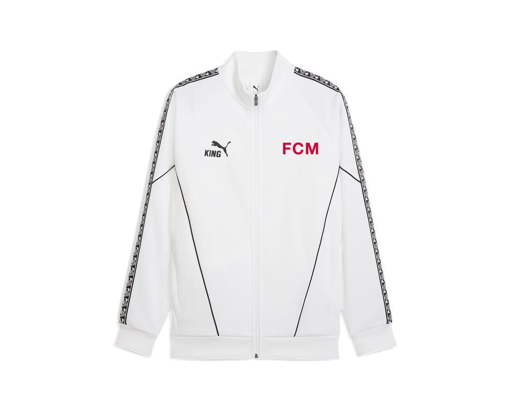 Gør dig klar til både komfort og stil med KING Travel Zip Cardigan i hvid – skabt til den FCM-fan, der ikke går på kompromis med detaljer. Denne cardigan kombinerer funktionalitet med et skarpt, sporty udtryk. På venstre bryst står teksten "FCM" med rød skrift, som et stærkt og stilrent udtryk for din klubstolthed. Langs ærmerne giver diskrete mønstrede detaljer et eksklusivt og dynamisk look, der løfter designet yderligere. På ryggen fremhæves din klubstolthed endnu tydeligere – her er "FCM" skrevet stort i rød farve, så det ses fra alle vinkler.