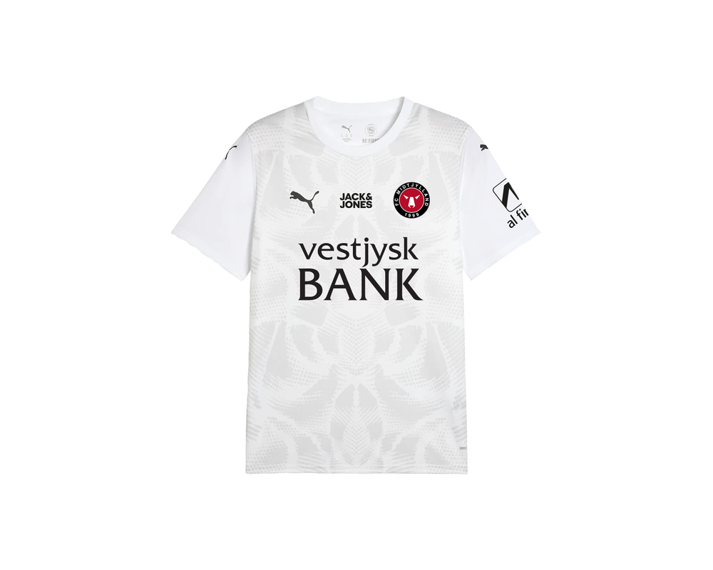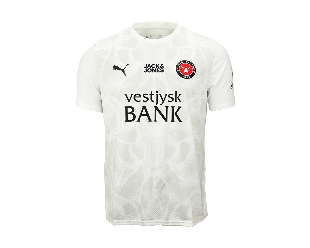 FC Midtjyllands officielle målmandstrøje for hjemmebanesæsonen 25/26 er skabt i samarbejde med PUMA og præsenteres i en elegant hvid nuance med et karakteristisk mønster, der giver et skarpt og moderne udtryk. Trøjen er konstrueret i et let og åndbart materiale, der understøtter maksimal bevægelighed og optimal ventilation – ideel til målmænd, der skal være skarpe og reaktionsstærke fra første til sidste fløjt.