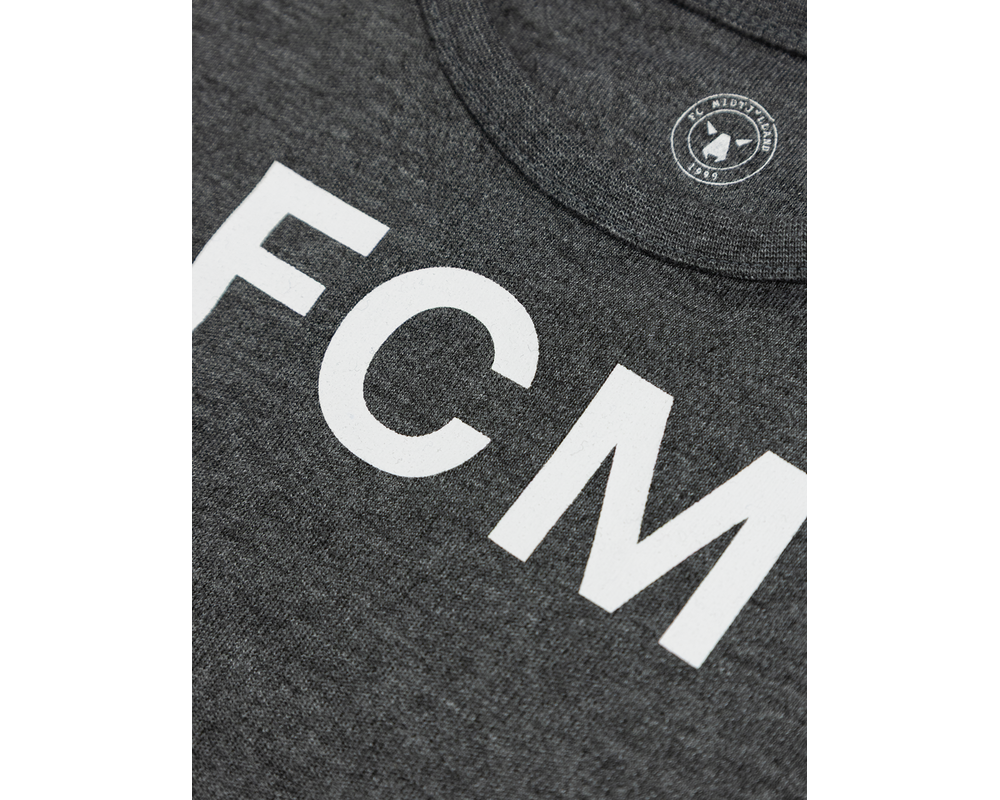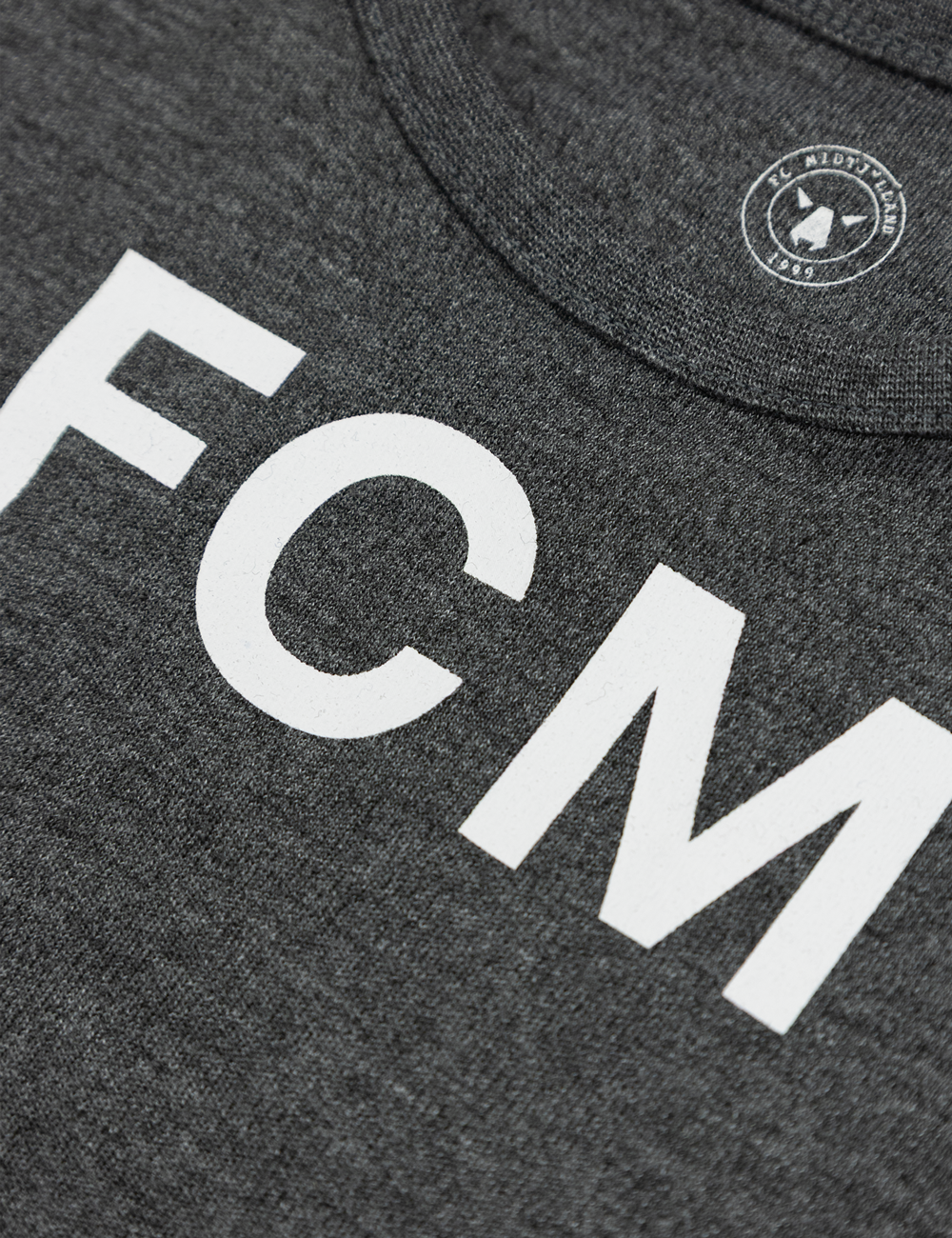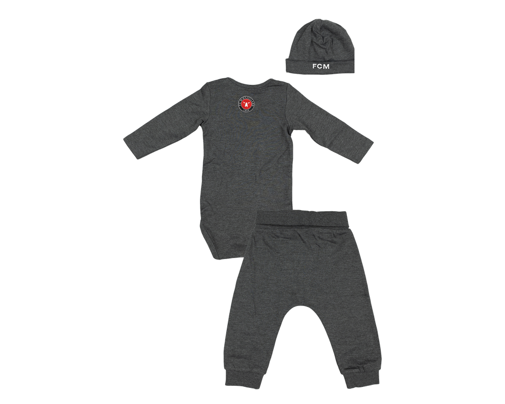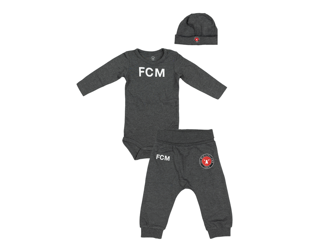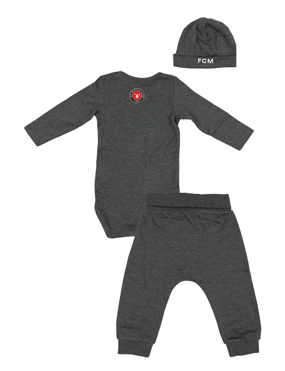 FCM baby body sæt i mørkegrå med hvidt logo på maven og FCM-logo på ryggen. Sættet inkluderer body, bukser og hue, alle med sorte kanter omkring åbningerne, hvilket giver et stilfuldt finish. Fremstillet i blødt materiale, der sikrer komfort hele dagen.