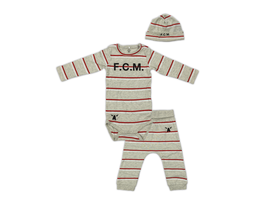 Forkæl de mindste FCM-fans med dette søde bodyset i lys grå. Sættet indeholder en body, matchende bukser og en lille hat, som sammen skaber et perfekt outfit. De hvide og røde striber giver et sporty udtryk, og FCM logoet på brystet kombineret med en lille ulv på body og bukser tilføjer sjov og personlighed. Lavet i blødt og behageligt materiale, der sikrer optimal komfort for din baby, både til leg og afslapning. En ideel gave til nye FCM-fans!
