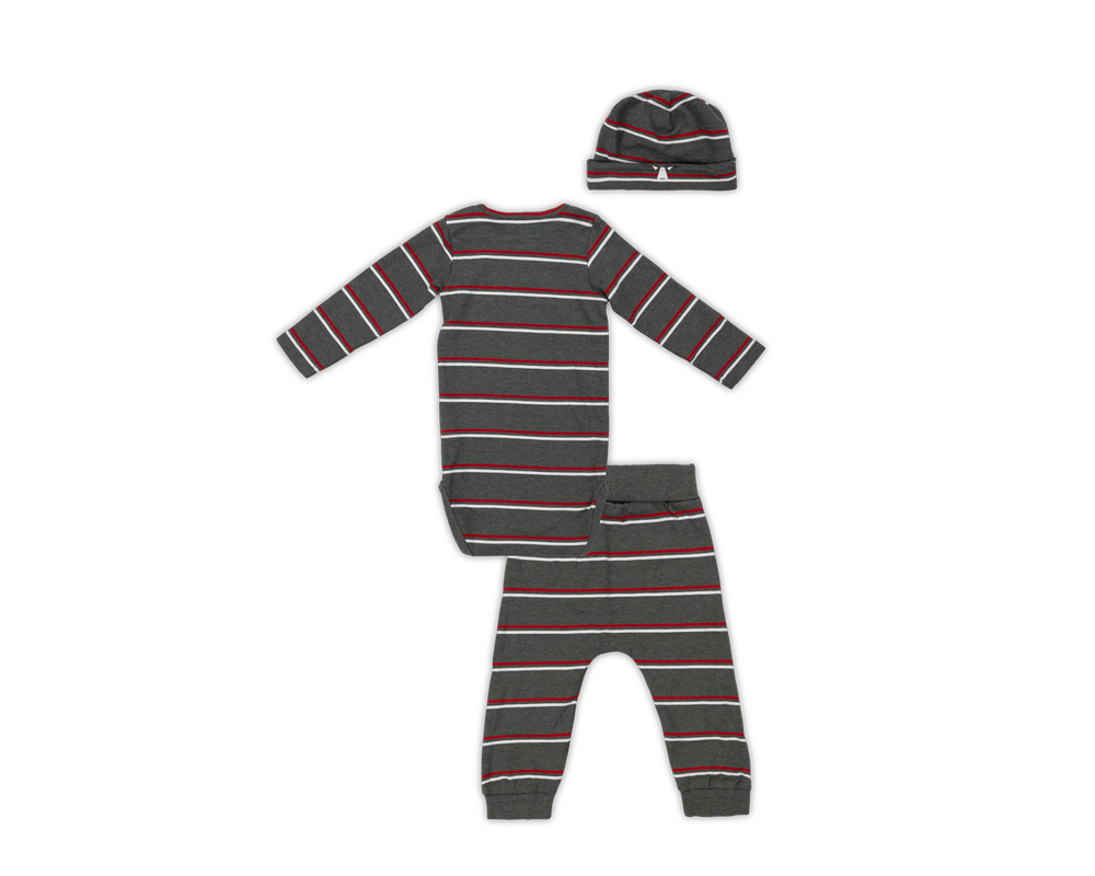 Gør de mindste fans klar til kamp med dette skønne FCM bodyset i mørk grå. Sættet indeholder en body, matchende bukser og en lille hat, som tilsammen giver et komplet look. De hvide og røde striber giver et sporty touch, og på brystet pryder FCM logoet stolt, mens en lille ulv skaber et sødt og legende element på både body og bukser. Det bløde materiale sikrer maksimal komfort for din baby, uanset om det er til leg eller afslapning. Perfekt som gave til de nyeste FCM-fans!