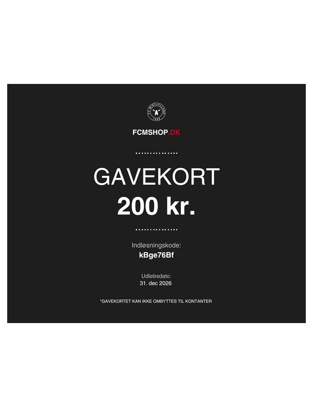 Bemærk: Der bliver tilsendt en kode på mail, sammen med kvittering. Koden kan kun benyttes online på fcmshop.dk