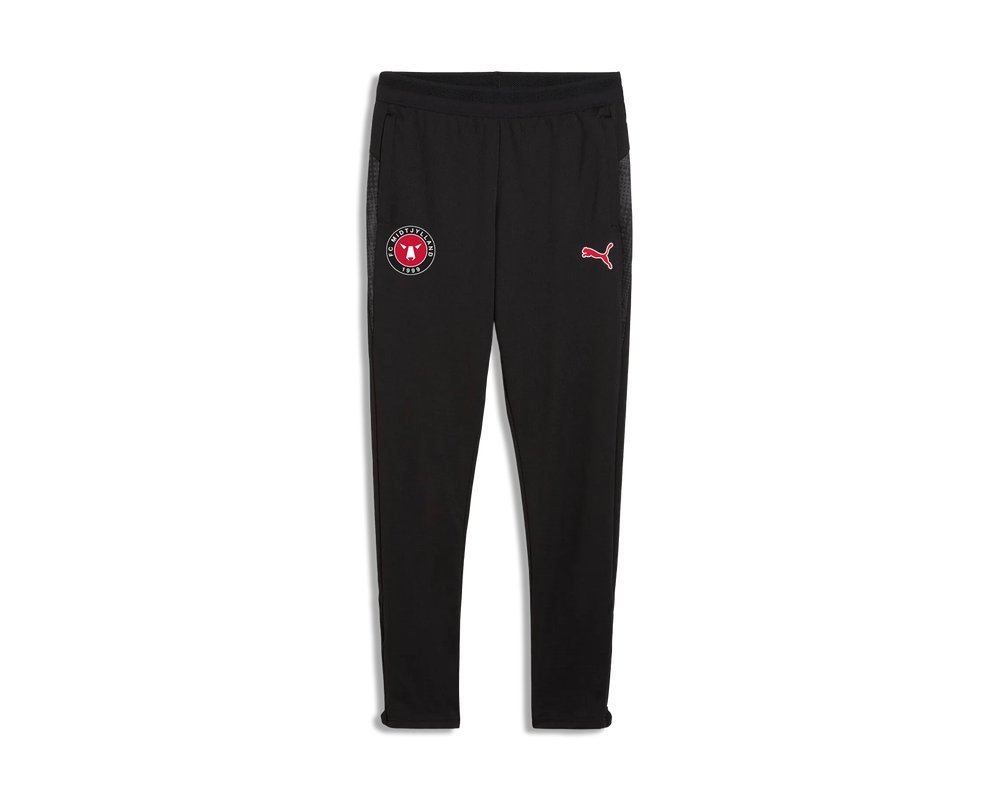 De nye FC Midtjylland pre-match bukser til børn kombinerer komfort og funktionalitet med lynlåslommer i begge sider til sikker opbevaring. De bruges af spillerne inden Superligakampe og har et klassisk FCM-logo på det ene ben samt et rødt Puma-logo for et stilrent udtryk. Bukserne bliver desuden brugt af spillerne inden superligakampe.