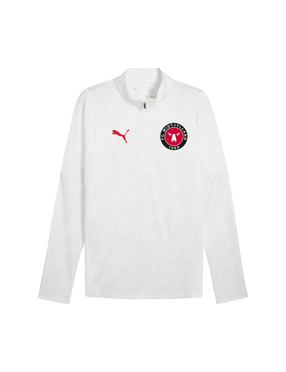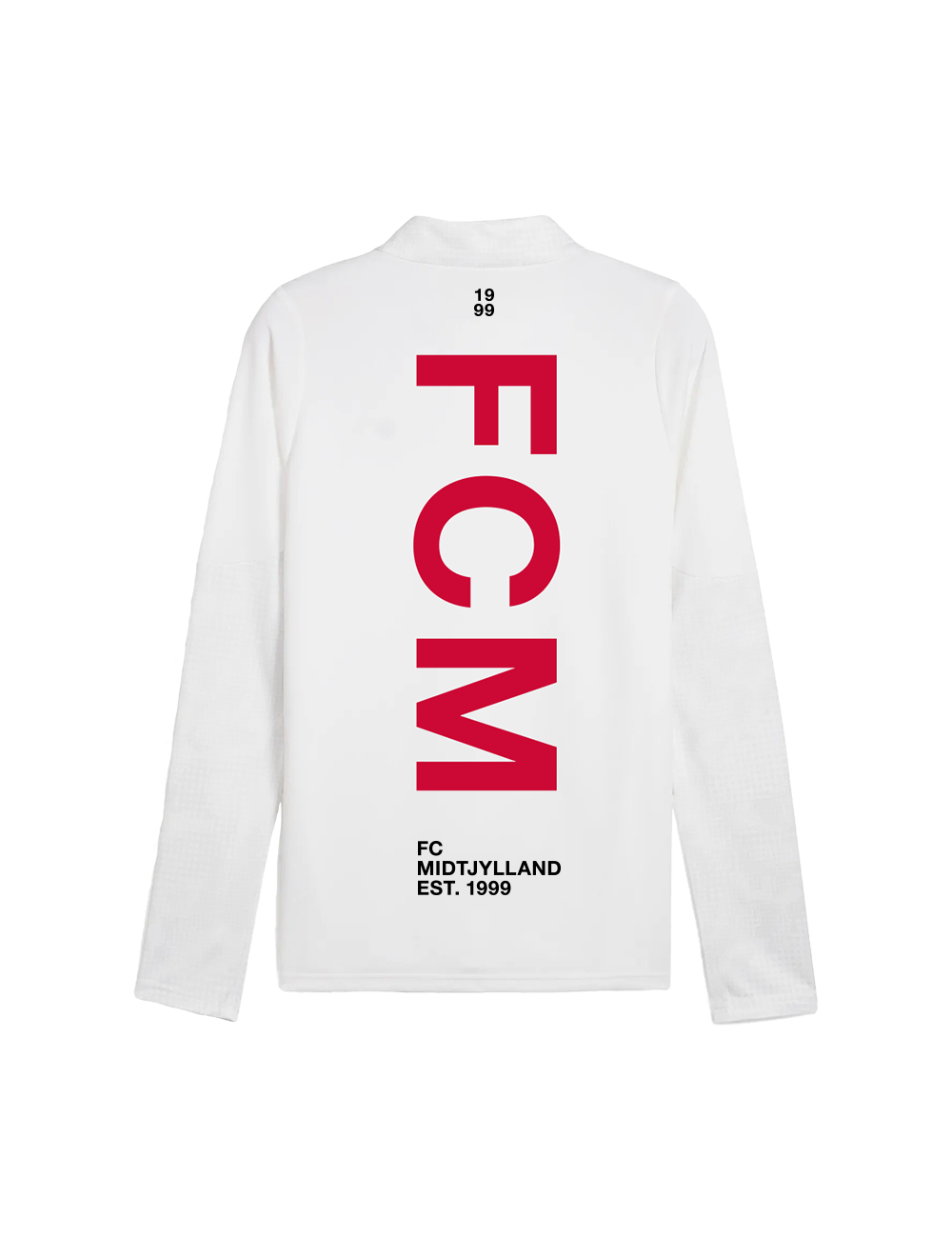 Gør dig klar til kamp med den nye pre-match midlayer fra FC Midtjylland til børn. Trøjen er fremstillet i et svedtransporterende materiale med høj absorberingsevne, der holder dig tør under opvarmning og træning. Den har en praktisk 1/4 lynlås, så du nemt kan justere temperaturen. Designet i stilren hvid med det klassiske FCM-logo på brystet og et markant rødt "FCM" tryk på ryggen.