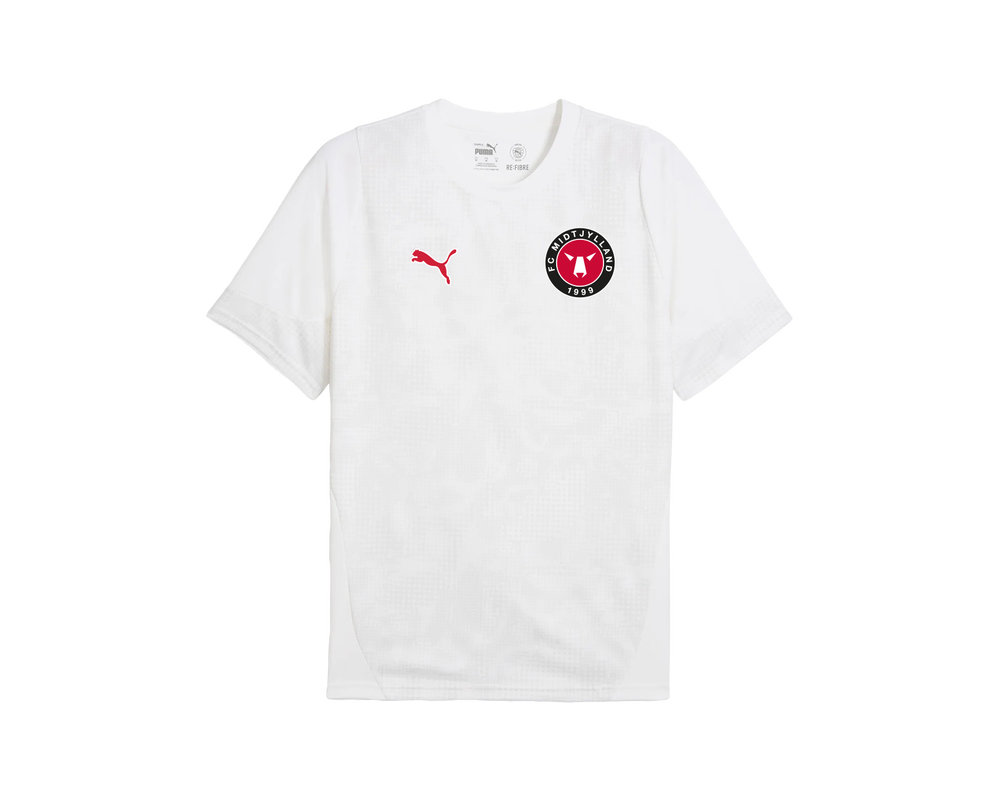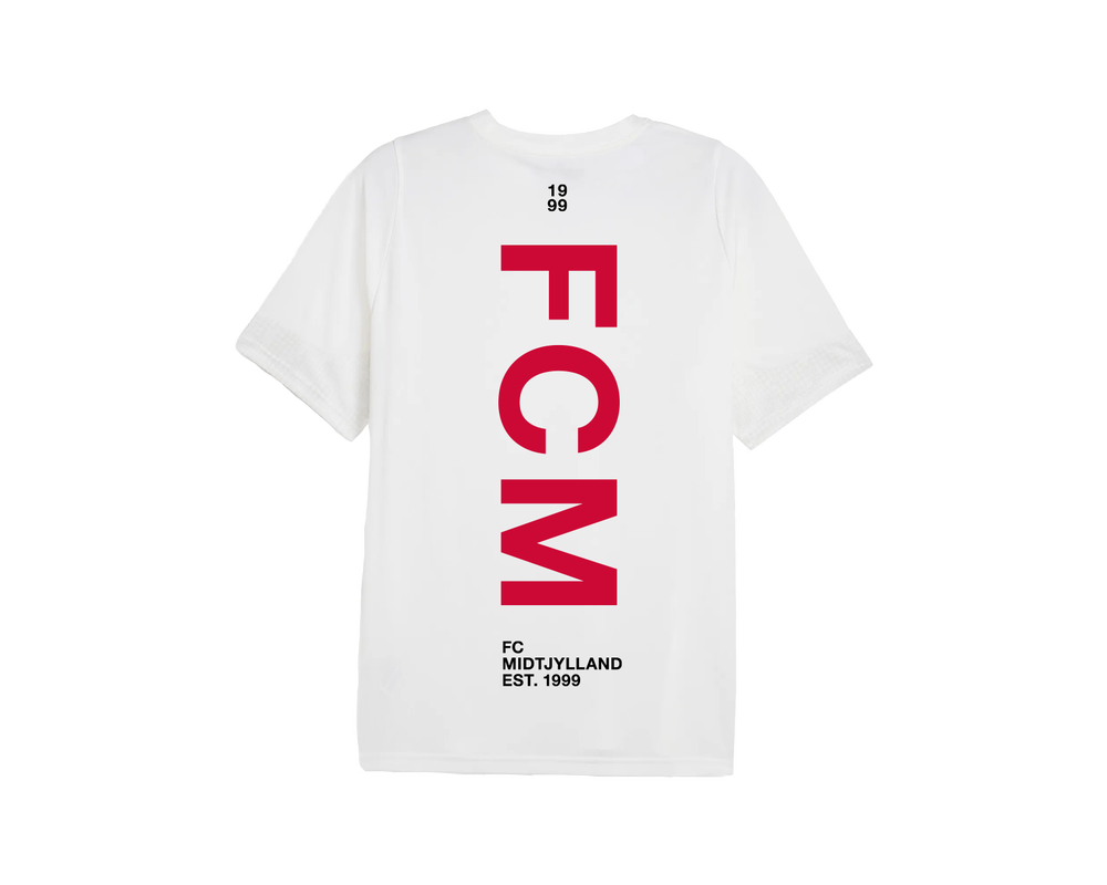 Med den nye hvide FC Midtjylland pre-match T-shirt får du en stilren og funktionel trøje med et klassisk FCM-logo på brystet og "FCM" skrevet på ryggen i rød farve. Fremstillet i svedtransporterende dryCELL-materiale holder den dig tør og komfortabel – ideel til opvarmning, træning eller hverdagsbrug.
