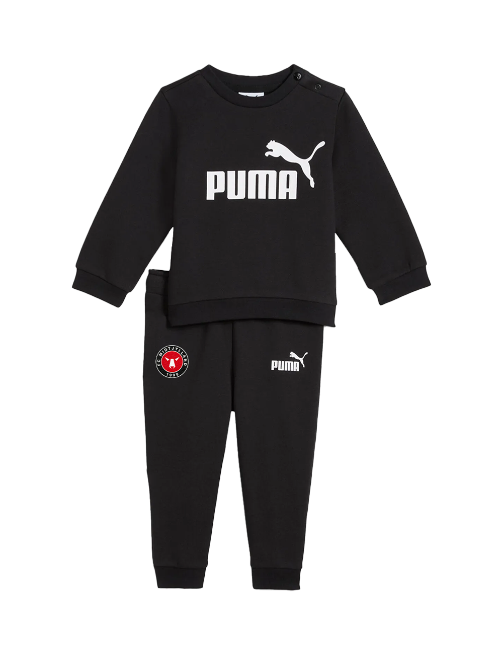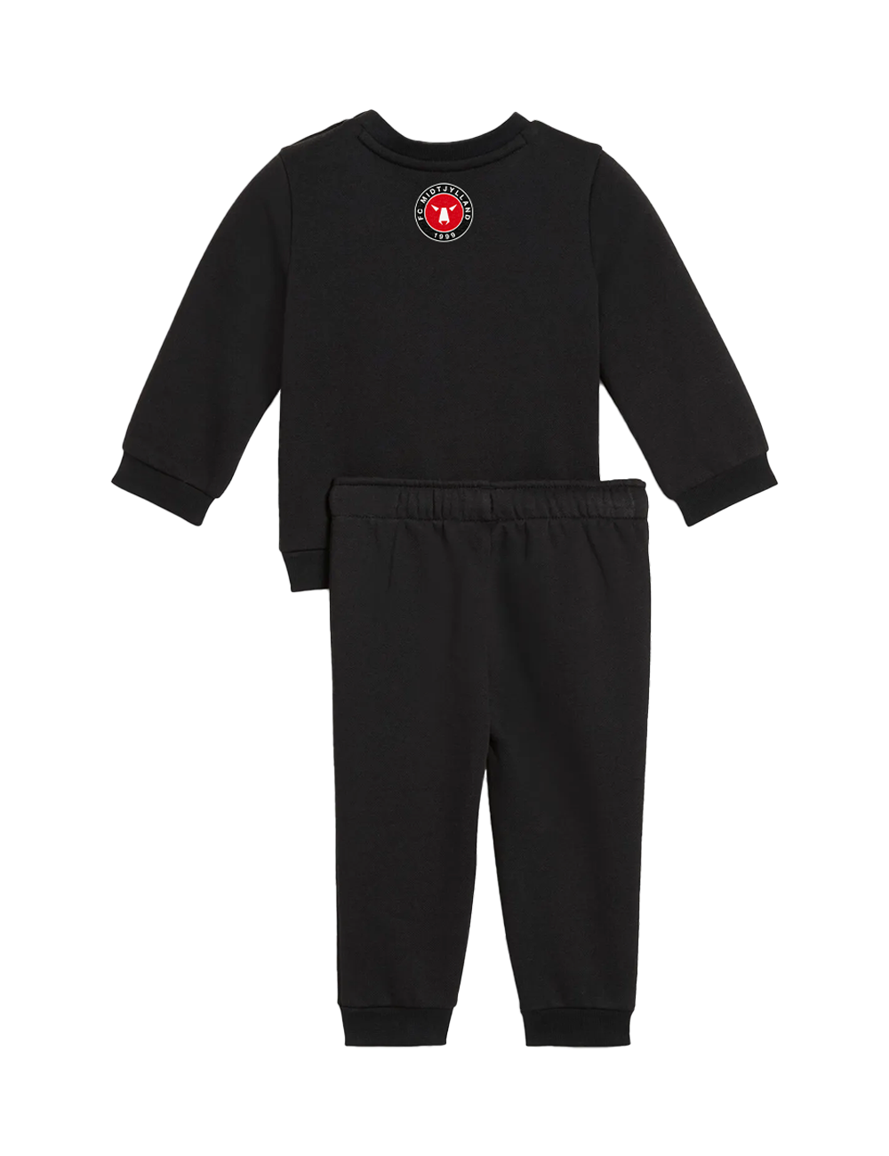 Sættet består af en langærmet sort sweatshirt og matchende bukser, begge i blødt fleece-materiale, der sikrer maksimal komfort hele dagen. Den markante gummiprint på brystet, FCM logo på buksebenet og de ribbede kanter giver et sporty udtryk, perfekt til både leg, afslapning og små eventyr.