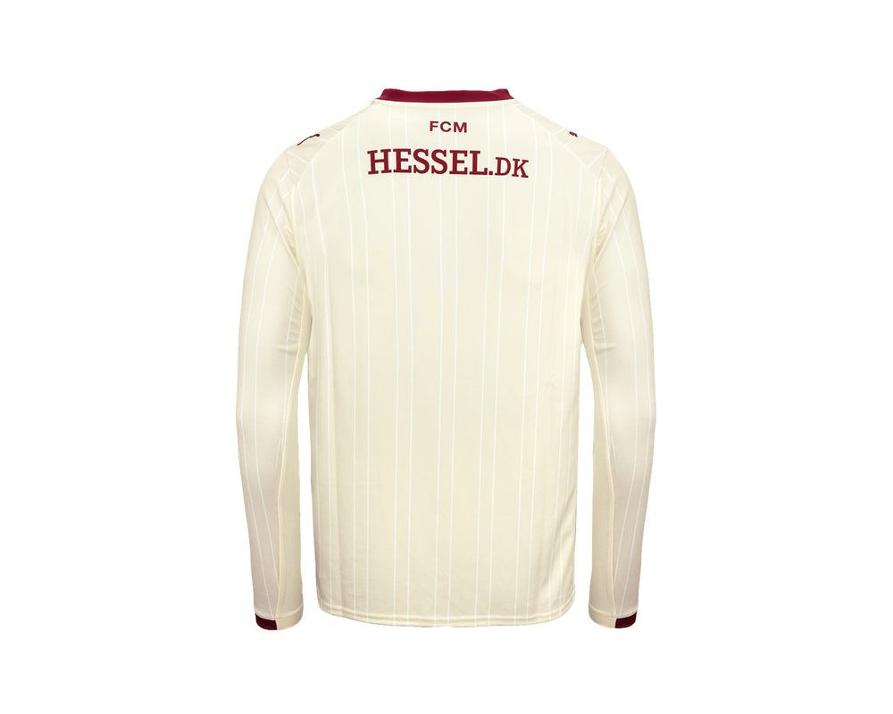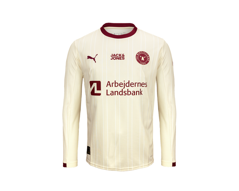 FC Midtjyllands tredjetrøje for sæsonen 25/26 kombinerer en lys cremefarvet base med elegante pinstripes og detaljer i dyb bordeaux. Samspillet mellem de varme farvetoner og det stilrene design giver trøjen et klassisk, men moderne udtryk. Denne specialdesignede spillertrøje bæres af ulvene på både danske og europæiske baner, når jagten på vigtige point fortsætter.