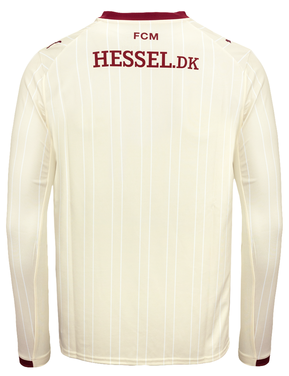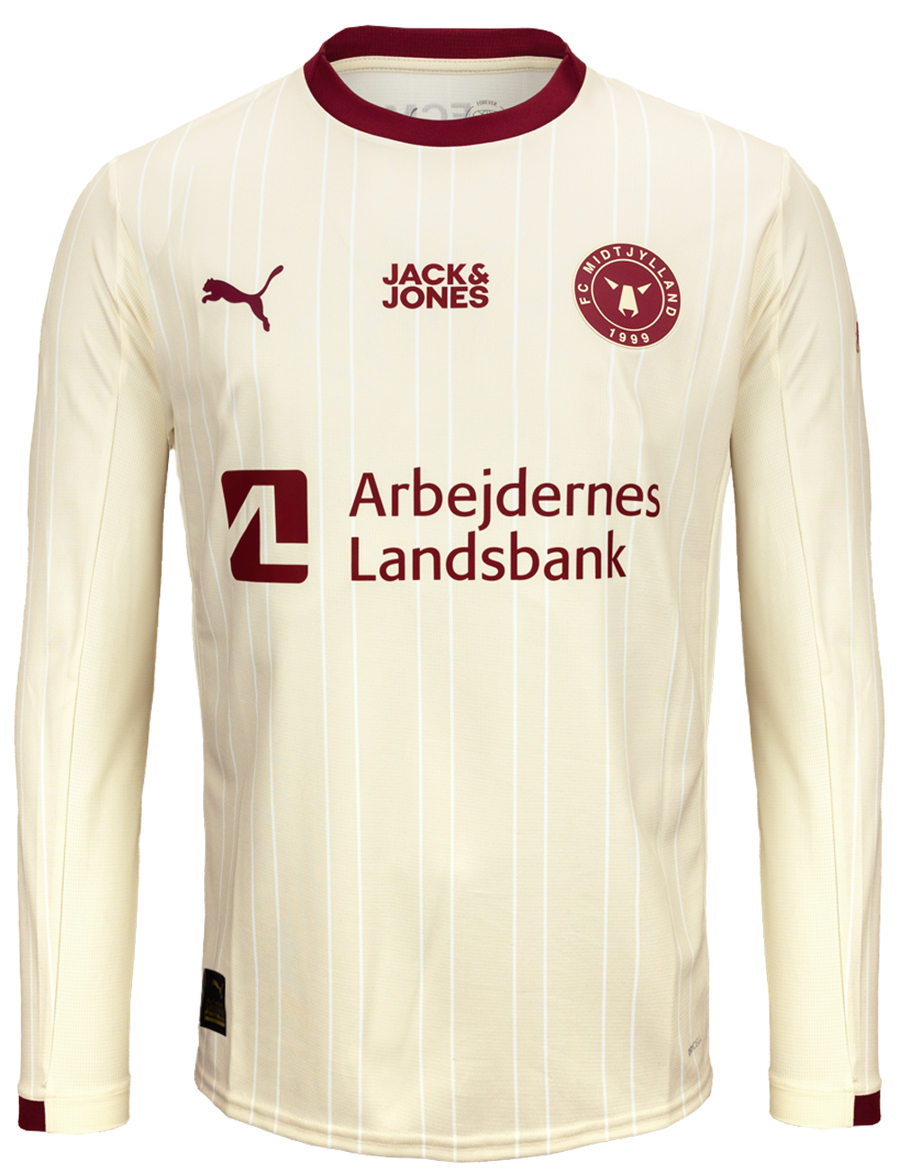 FC Midtjyllands tredjetrøje for sæsonen 25/26 kombinerer en lys cremefarvet base med elegante pinstripes og detaljer i dyb bordeaux. Samspillet mellem de varme farvetoner og det stilrene design giver trøjen et klassisk, men moderne udtryk. Denne specialdesignede spillertrøje bæres af ulvene på både danske og europæiske baner, når jagten på vigtige point fortsætter.