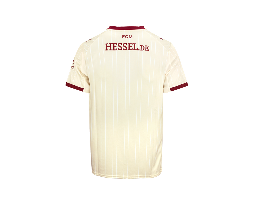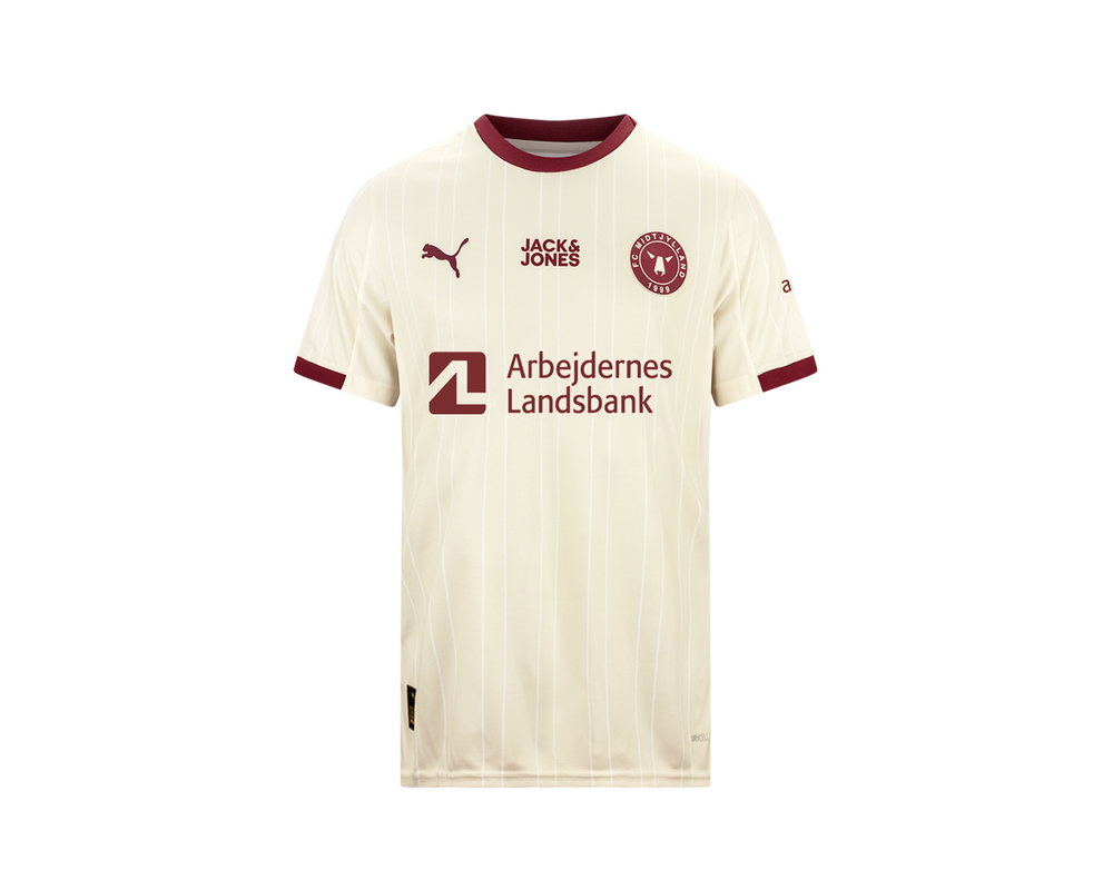 FC Midtjyllands tredjetrøje for sæsonen 25/26 kombinerer en lys cremefarvet base med elegante pinstripes og detaljer i dyb bordeaux. Samspillet mellem de varme farvetoner og det stilrene design giver trøjen et klassisk, men moderne udtryk. Denne specialdesignede spillertrøje bæres af ulvene på både danske og europæiske baner, når jagten på vigtige point fortsætter.